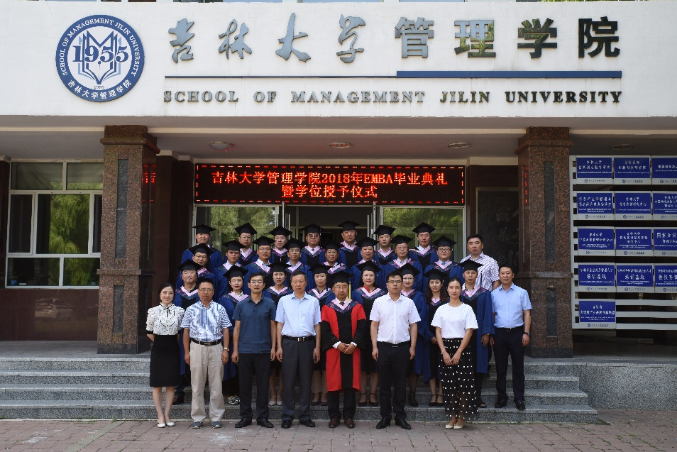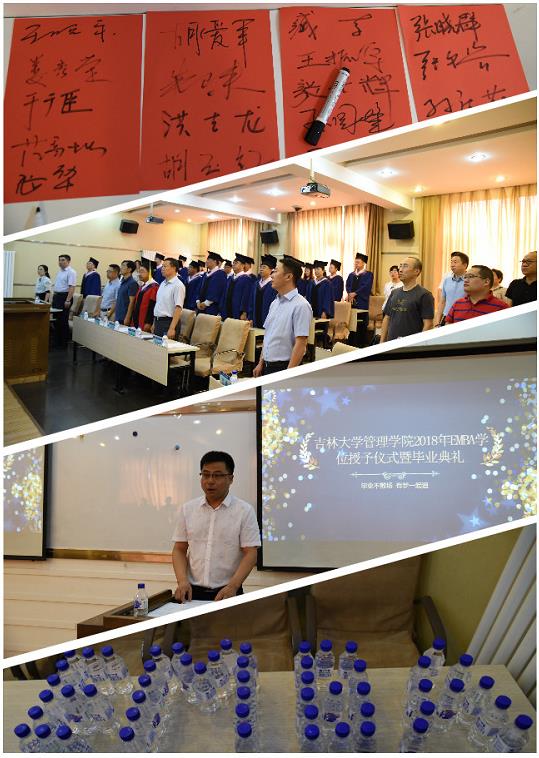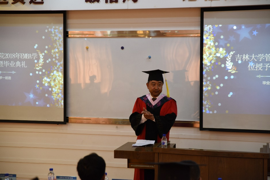 2013、2014级EMBA学员表示热烈的祝贺。院长在肯定了每位学员的不懈努力,以特有的毅力品质克服了工作及事业方面的诸多困难取得优异成绩的同时,对所有EMBA毕业生与在读学员提出了三点新要求:1、“千年暗室,一灯即明”。 院长希望大家今天毕业于吉大管院EMBA,日后也要养成并保持学习的能力。只有坚持学习才能有助于加快知识更新、优化知识结构、拓宽眼界和视野,从而增强工作的科学性、预见性,在时代浪潮中赢得主动、赢得优势、赢得未来;2、“为学之实,固在践履。苟徒知而不行,诚与不学无异。”院长希望每位管院EMBA毕业生牢记吉大管院EMBA“近贤达、破格局、论恒越之道”的初心,将所学到的知识和才华无私地奉献给国家的富强与民族的振兴事业,做到一个真正具有工匠精神的企业家。3.心系母校。“既入管院门,终为吉大人”希望每个人律己隆法,修身明德,不辱使命,不负重托。
