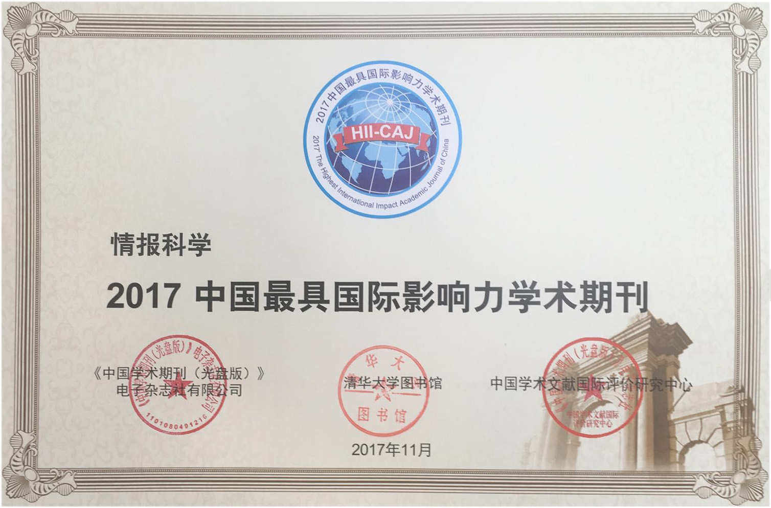 冰球突破 《情报科学》获评“2017中国最具国际影响力学术期刊”(人文社会科学),自2013年以来,《情报科学》已连续五年获此殊荣。
