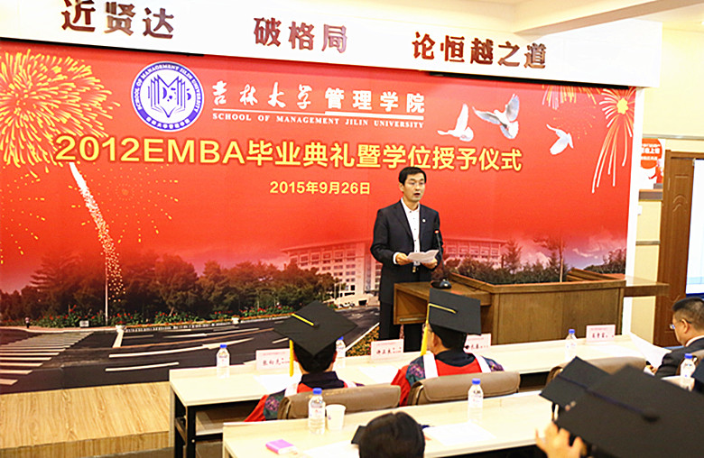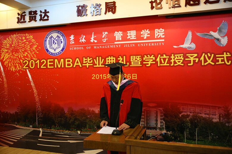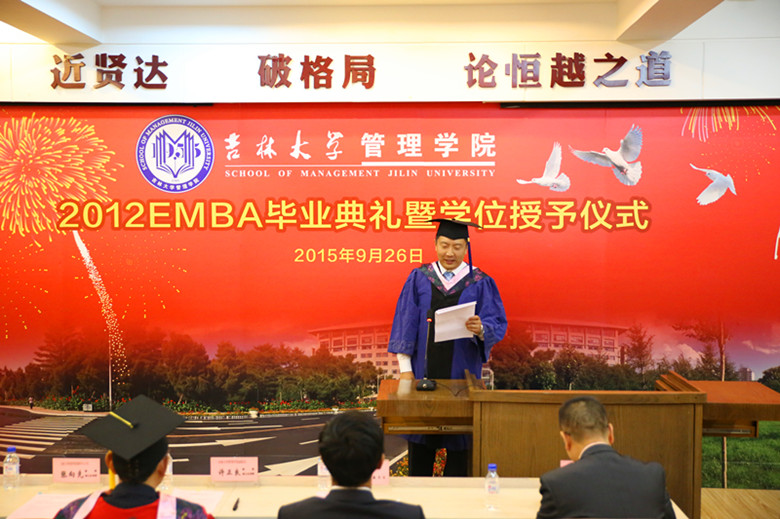 2012EMBA学员郭钰同学代表毕业同学发言,他说:“今天虽然离开了校园,但是我们的心并没有离开吉大。我们还是吉大人,我们还属于这个广阔的舞台。告别校园后 要走的路更长,让我们共勉,用实际行动和工作成绩向母校及冰球突破