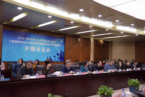 开题论证会由蔡莉教授主持。项目首席专家王晰巍教授代表课题组汇报了重大课题目的与意义、总体框架和预期目标、重点难点及创新之处、子课题主要内容、研究计划及预期成果。评议组各位专家在认真听取王晰巍教授的汇报之后,高度评价了项目的研究思路与现实意义,认为课题整体研究思路清晰、逻辑性强;子课题之间结构完整、研究内容重点突出;团队组成既有国内又有国外学者,既有学者又有行业专家,很好地兼顾了学术性和社会应用价值;课题基于信息生态视角构建大数据驱动的社交网络舆情主题图谱,研究视角独特。同时,专家组对重大项目下一步的推进提出了宝贵意见。靖继鹏教授建议后期重视项目成果在应用环节的成果延伸,并通过课题研究培养人才和加强高层次人才队伍建设;朱庆华教授建议后期推进时应注意子课题之间协同研究,研究成果在发表学术论文过程中,更应该关注成果的应用和成果简报的上报;卢晓宾教授建议未来研究中关注理论与应用的结合环节,为网络舆情监控在策略制定、法律法规编制等环节提供参考;王芳教授建议应结合网络舆情变化性和时效性的特点,对社交网络舆情知识图谱的实体和关系做好分类研究;毕强教授建议课题研究应与计算机学科等领域积极结合,采用深度学习等技术方法研究社交舆情数据背后的人际关系网及情感演化问题,同时要注意从情报学的学科角度进行主题知识图谱构建;蔡莉教授在总结时强调,课题基于中国社交网络舆情的现实情景和实践问题导向进行研究方案设计,建议研究视角分析中注重从生态系统的本质出发,采用“共生”“多主体互动”及“过程理论”研究系统中多个子课题的互动与协同效果,加强质性研究、案例分析和定量研究方法的结合,发挥冰球突破