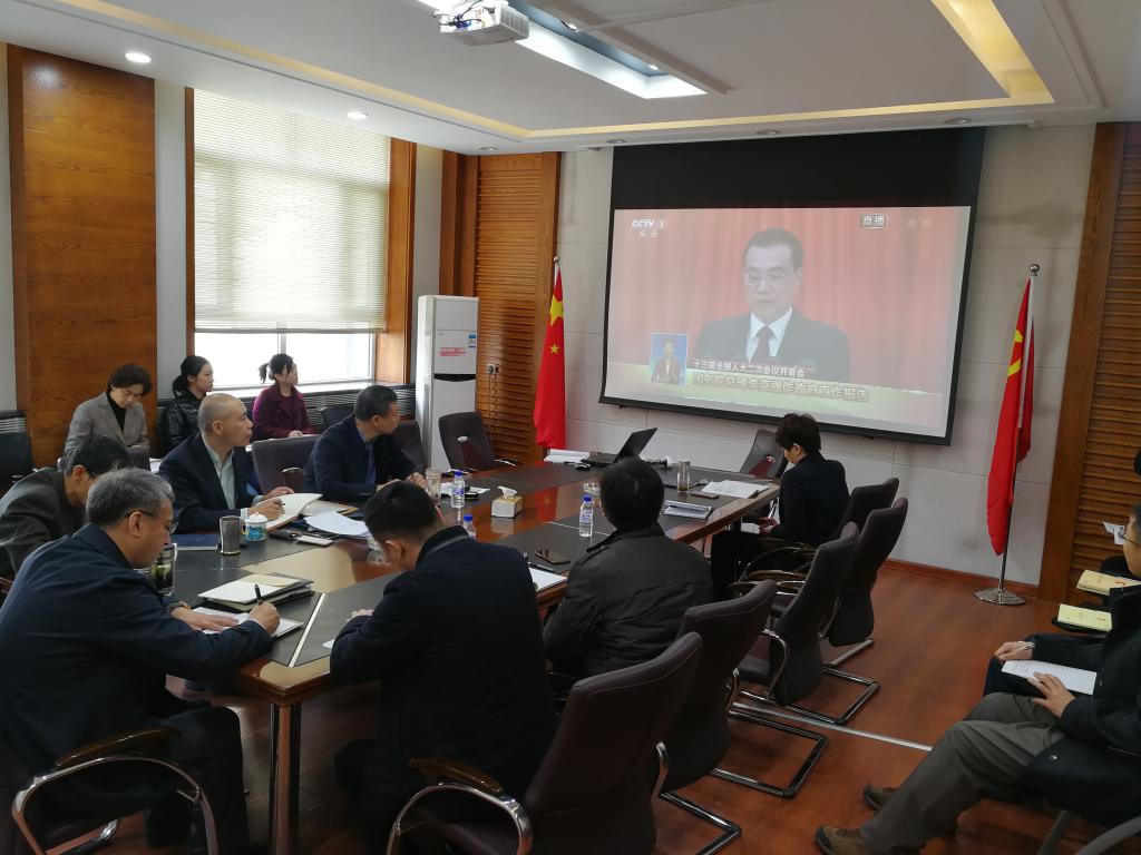 领导班子在管理楼二楼会议室集体收看十三届全国人大第二次会议李克强总理所做的政府工作报告。机关党支部的党员也参加了此次集体学习,学习会由院党委书记张兴林主持。