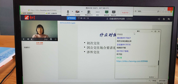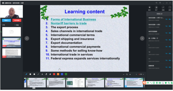 2月24日,经过紧锣密鼓的准备,终于迎来开学正式上课的一天,也同时迎来网络平台最“压力山大”的一天。前一晚,超星服务平台突然告之2月24日将暂停直播功能!临时的通知给准备上课的老师陡然增加压力。基于之前多次的演练和调试,国际商务系的老师们并没有惊慌,而是准备充分的预案来应对任何网络不稳的情况。杨红老师针对24日上午的直播课程做了几个预案,包括预先录课,以防止所有直播平台出现崩溃。她早起在高峰前就登录上学习通直播软件,同时打开腾讯会议室,让学生提前进入会议室。上课时在会议室里进行直播并分享屏幕。用这种方式流畅完成授课,并且不需要学生多次登录和退出,老师端自行操作“开始”和“结束”直播,以掌握正常录课的时长。在上课过半时,学习通直播功能突然停止,杨老师马上启用第二预案,继续用腾讯会议直播上课,同时用电脑预先下载的EV软件进行录屏。学生听课没有受到任何影响。