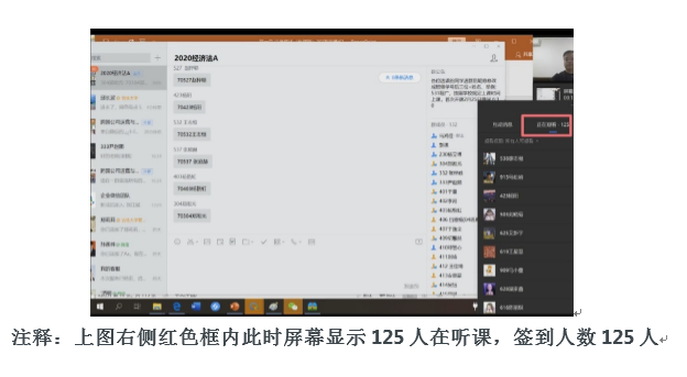 “企业微信”直播授课时,在教师直播端口是完全可以看到进入课堂上课的人数,同时也能了解有多少人登录了你的直播平台,正在听你的课程。并且教师如果想点名,可以要求学生,按照教师的规则,输入一个指定的“暗号”到课程群内,限时1分钟,例如:按照指定要求输入学号后4位+姓名,这样,在一分钟之内就可以完美实现目前在线上课人数的签到,与屏幕显示的上课人数毫无差异。