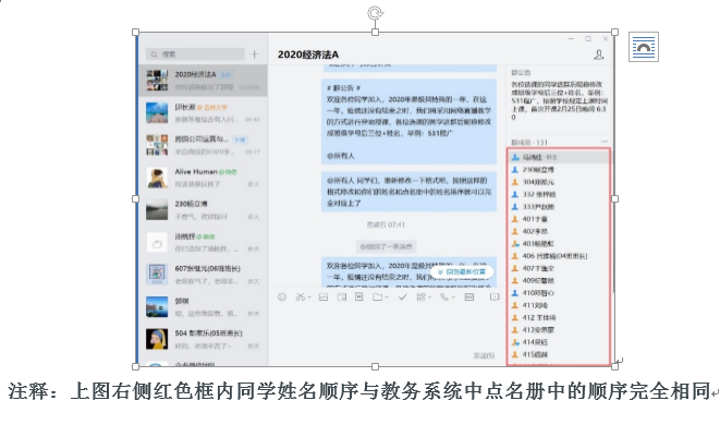 要想利用好“企业微信”平台就要先建立企业微信群(与我们常用的微信群建立如出一辙),首先,授课教师要注册一个企业微信号(一个手机号只能注册一个),把你的企业微信二维码,发给选课班的班长,通知班长加教师为好友。然后,像微信群一样,你可以添加几个班长先成立一个企业微信群,然后公布该微信群的二维码,让各个班班长通知选课的同学加入。再后,在群内你可以发布一个公告:要求进入群的同学按照指定格式修改群昵称,我采用的格式为要按照学号后3位+姓名(如果你的选课学生有大于2位数的自然班,你可以选择后4位+姓名的格式),这样一来,所有同学在群内的排序,与你从教务系统中打印出来的课程表排序完全一致。至此,你对选课学生名册一目了然,很清楚选课学生是否有遗漏,还有哪位同学没有进入群内,以此实现学生课程群的完美管理。