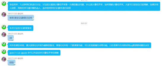 对于讨论与答疑,韩飞老师选择依托QQ群,以打字的方式进行。QQ群打字的好处是,学生更乐于以打字的形式进行发言,学生参与课堂活动的程度更高。腾讯会议等语音的方式只能选择少数人发音,如果参与人数太多,会使会场嘈杂,而采用打字的方式,可以让所有的学生都参与进来。同时QQ群能够记录讨论的内容,便于存档。