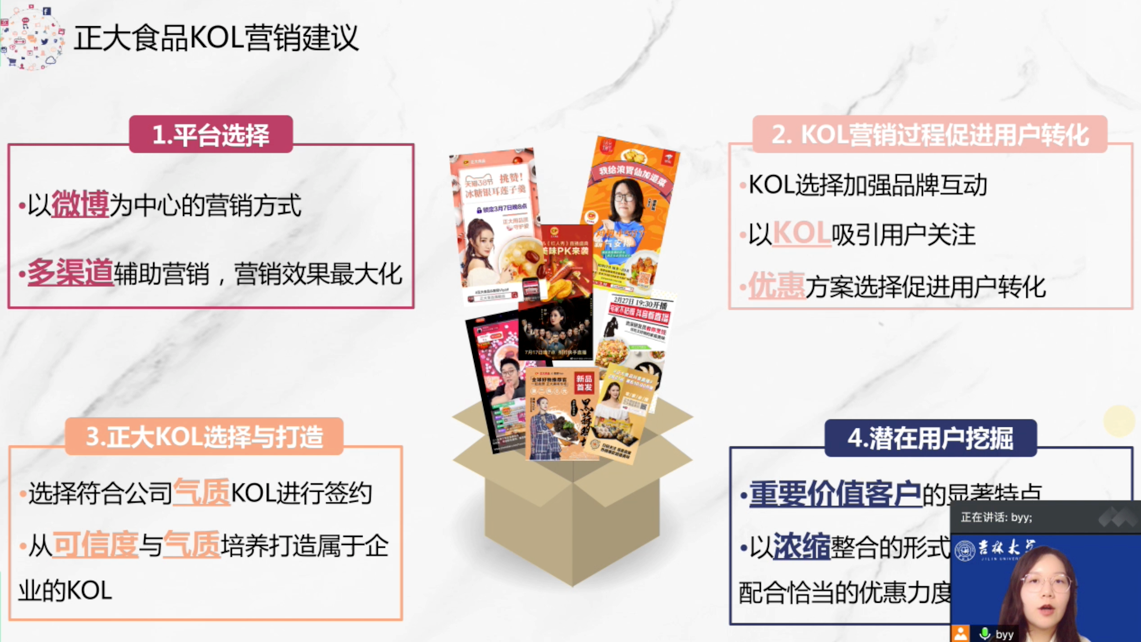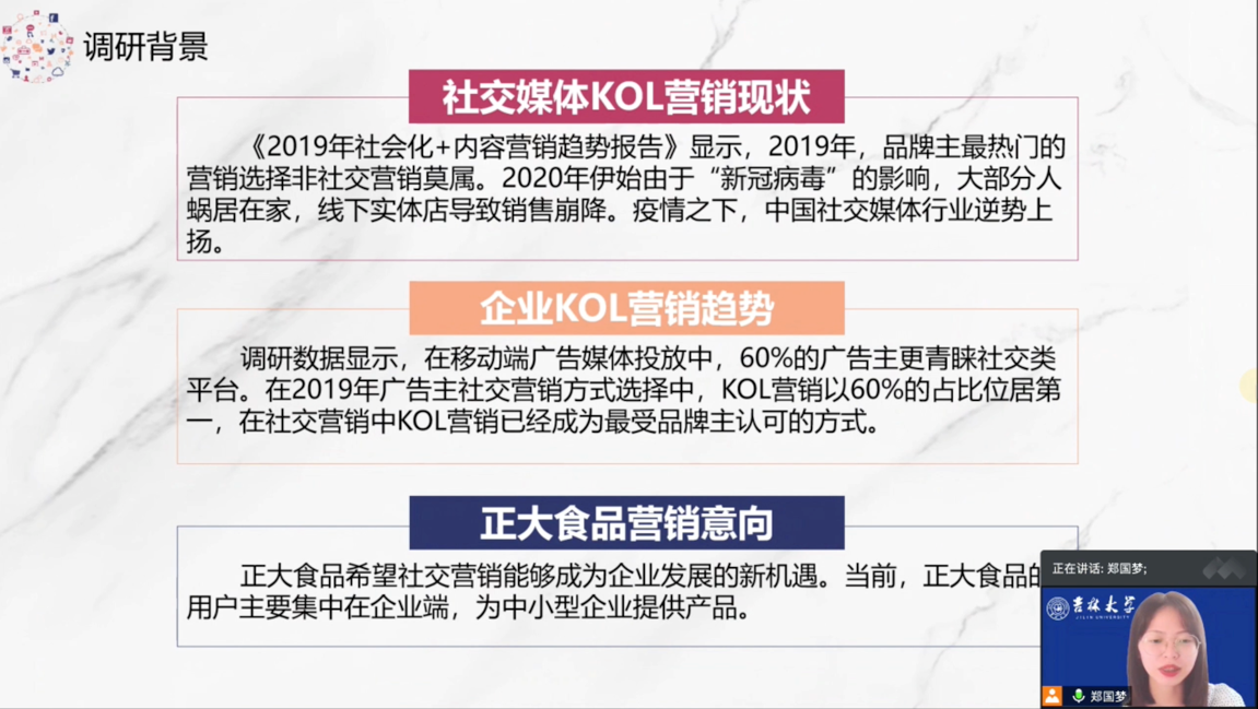 本科生郑国梦、陶冰心和毕樱瑛3名同学共同完成的《如何在直播带货中“C位”出道——正大食品Influencer Marketing的KOL用户行为及营销调查研究》作品,通过网赛、校赛、省赛和国赛的层层选拔,荣获全国总决赛国家级一等奖,这也是冰球突破