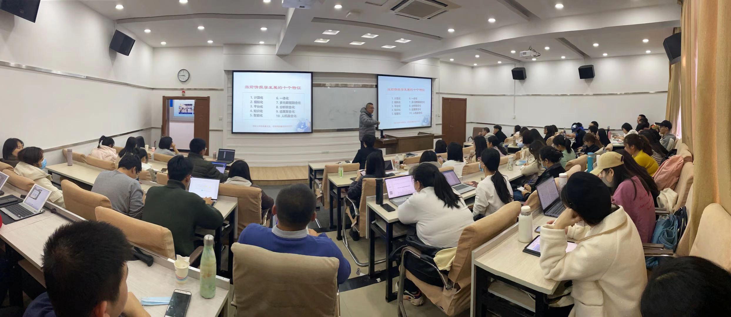 李广建教授结合自身科研与教学的经历,与师生们分享了其关于大数据时代情报学科的思考。报告开始,李广建教授和大家一起回顾了情报学学科发展的历程,李广建教授指出随着情报学不断的发展,其学科作用和地位与社会需求背景下的未来发展目标产生一定冲突,需要新的情报学体系架构。基于学科目录和国家标准,结合概念术语和情报时间,李广建教授讨论了情报学的内涵和外延。他提出目前图情领域中的情报学其本质仍然是“科技情报学”,情报学的学科发展不应盲目地无限扩大外延,同时应该注重多学科联合,发挥聚合效应。接着,李广建教授以论文与项目案例相结合的方式详细介绍了大数据环境下情报学发展的十个特征,分别是计算化、模拟化、平台化、知识化、智能化、一体化、多元数据融合化、分析联合化、结果聚合化以及人机融合化。计算化是计算思维和情报思维相结合的产物,强调通过数据驱动的方法将情报需求或情报课题转换成可形式化表达或求解的问题;模拟化则是指通过复杂、动态仿真方法和技术根据以往的情报现象演化的过程和规律,抽象并验证出情报现象演化的关键特征;平台化则是指将成熟的、共性的研究方法和技术进行抽象集成、封包成为“平台”,基于平台实现最大程度的重用,从而实现规模化情报分析和服务;知识化则是要求发现蕴含在大数据中的隐藏的模式、规律、因果关系等高阶知识;智能化是指以情报思想为指导,以解决情报问题为目标,实现数据、信息知识、情报智慧的转化管理与应用;一体化则是指情报工作由跨部门或跨国的同类信息或情报的共享与交互发展为情报深度全域融合的一体化;多元数据融合化指的是从不同角度刻画情报对象的特征,以更加全面、系统的方式刻画和描述出情报对象的发展状态和趋势;方法联合化指的是数据驱动型方法和知识驱动型方法的联合化;结果聚合化指的是在情报领域利用群体智慧效应获得相对最优的情报问题解决方案或分析结果;人机融合化则是指在情报工作中使机器概率化的智能与情报人员有机化的智能相互融合,互为补充,共同协作完成复杂的情报任务。本次报告在与会师生同李教授进行的交流中圆满结束。