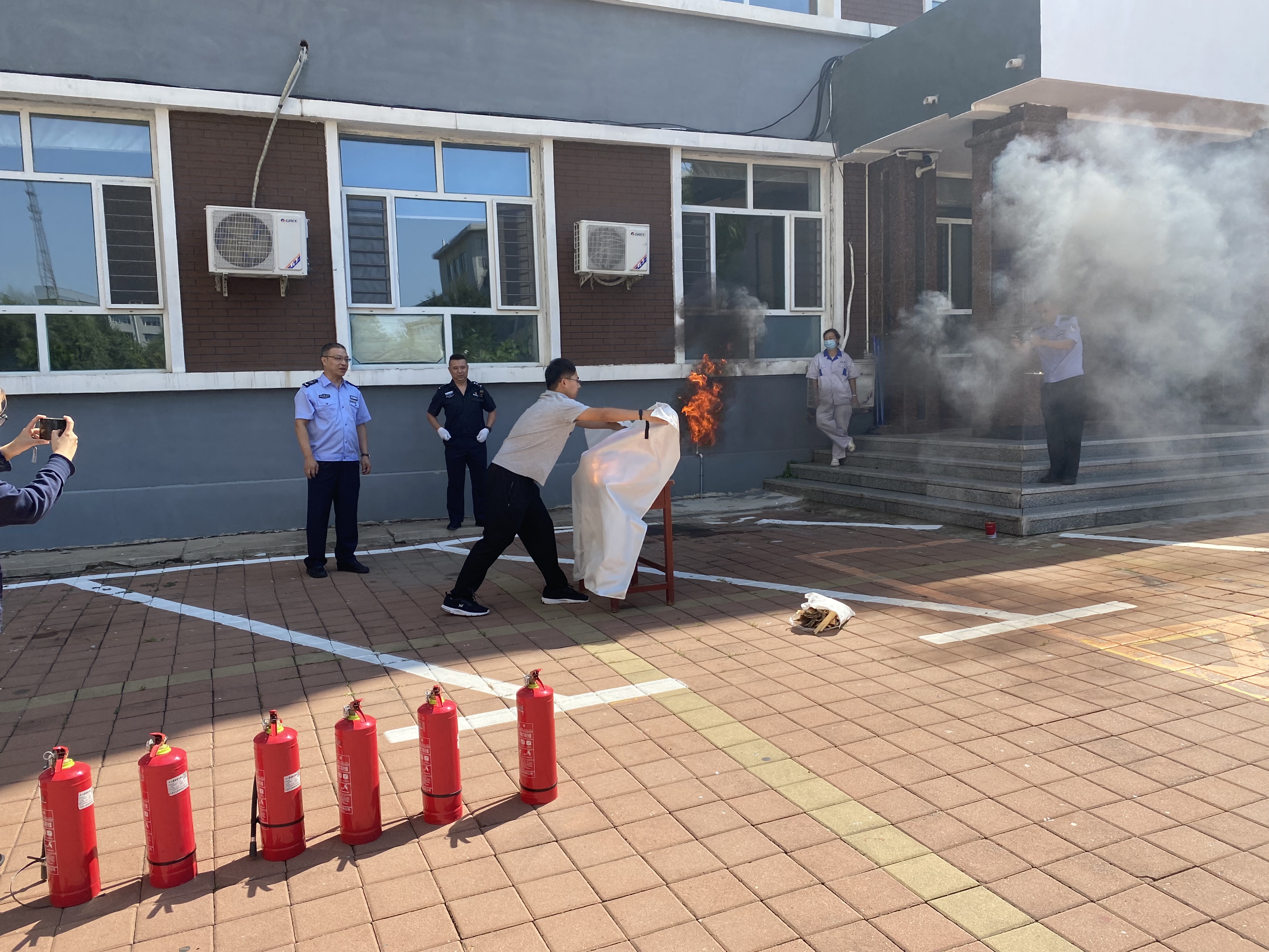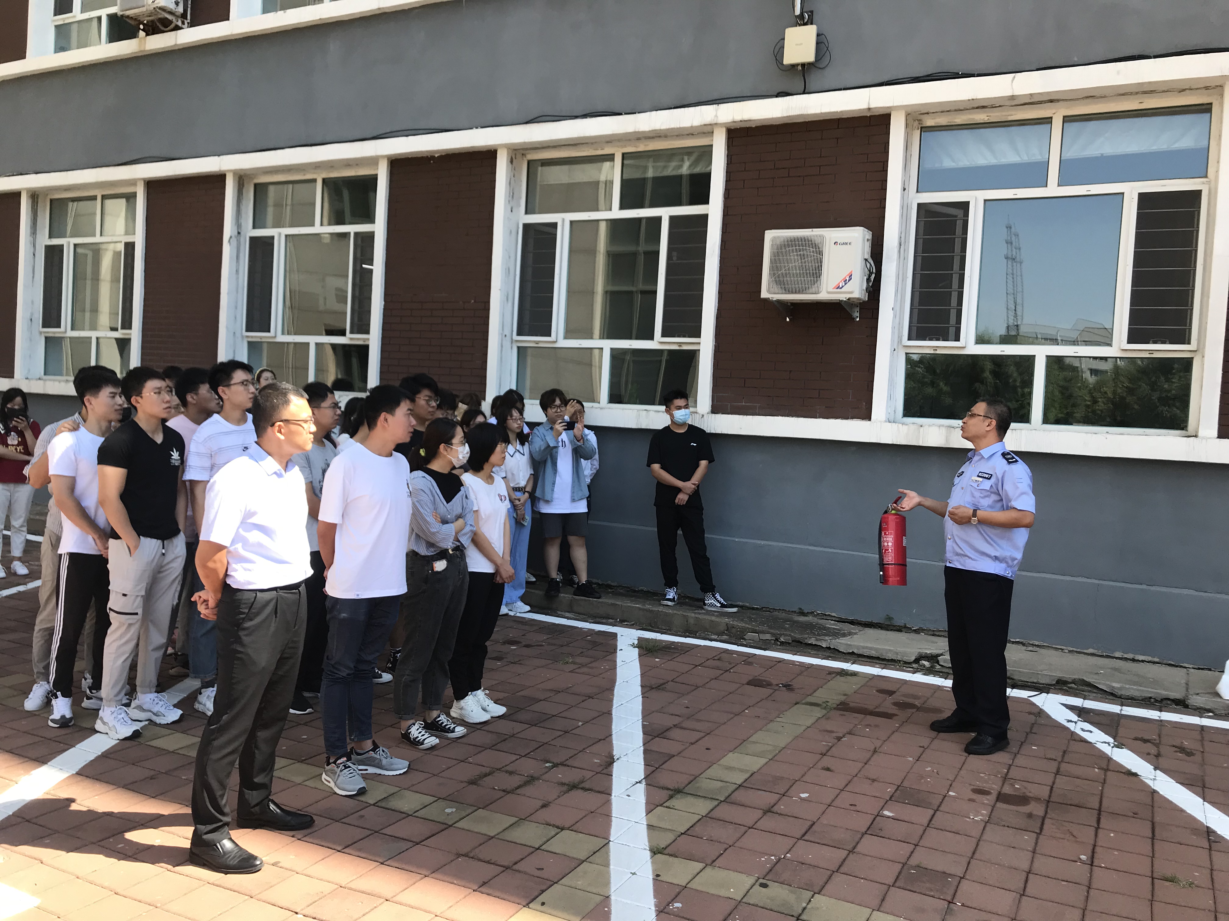 上午11:00,在管理楼前,东区保卫办消防科韩旭老师结合演练过程中的一些现象,为师生讲解了火灾逃生的方法及注意事项,并现场示范了灭火毯、灭火器的使用方法,现场师生也积极参与,实地演练正确的灭火方法。