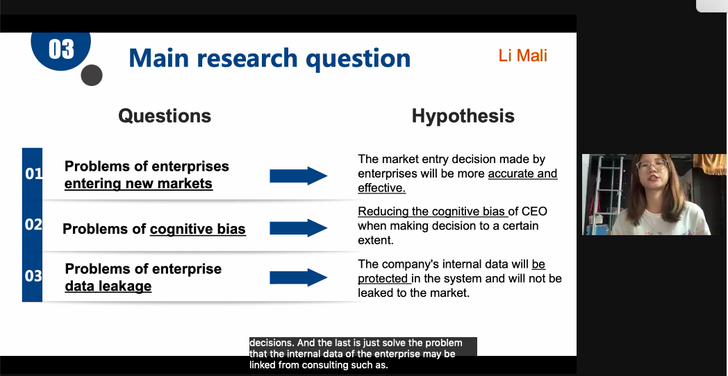 第四组的研究主题为“基于AI知识研究一个能够使企业市场进入决策得到优化的平台”。在小组的项目中利用了在AI项目中学习到的领域知识和方法将Decision Tree、 Baconian Method和Porter’s Five Forces Model融入到小组的研究当中,小组将研究重心放在市场进入当中,并且想利用搭建一个能够收集数据、分析数据、给出参照结果的AI平台来支持CEO决策。