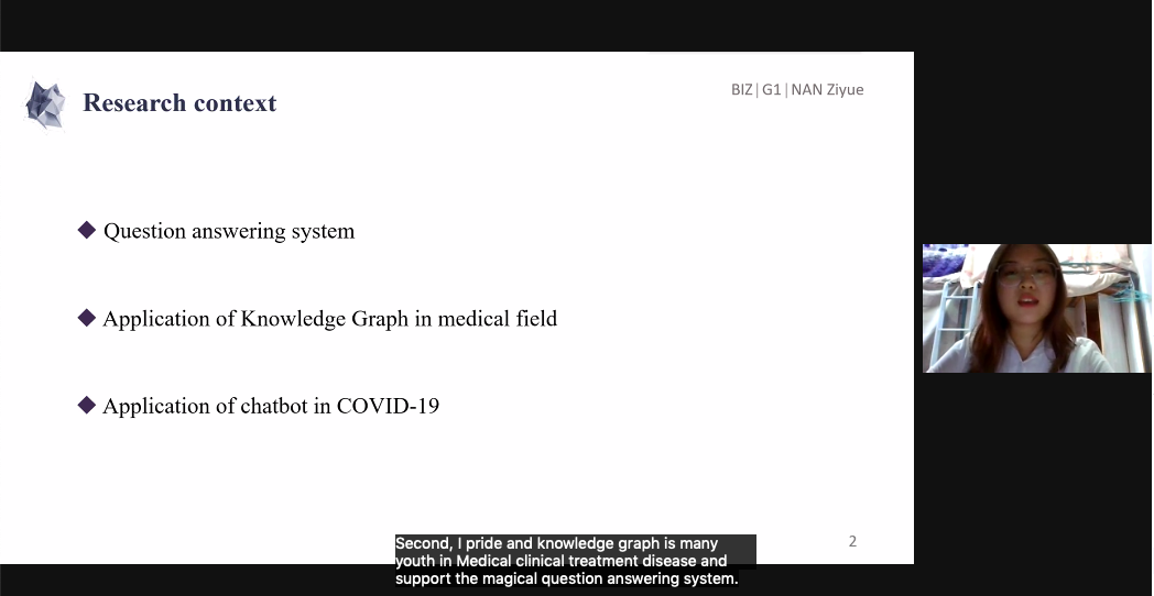 第一组的研究主题是“人工智能背景下聊天机器人在新冠肺炎疫情领域的应用”,研究目的是通过实现人机交互、聊天机器人操作、评价聊天机器人,并不断人工升级,使机器人可以成为新冠肺炎疫情的医学顾问,最终可以用于新冠肺炎疫情的预防和控制。