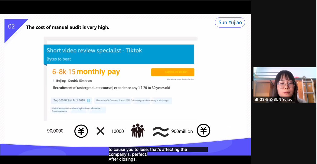 第三组的研究主题是“互联网短视频企业”,小组以抖音为例进行研究。在研究初期确定了研究问题:短视频企业是否有AI可以做的决定?经过查找资料和走访,发现在内容审核上也许可以尝试运用AI。针对AI算法小组构建了信誉积分模型:当AI判定审核事件超过一定次数低于一定分数时才不予审核通过。该模型的科学性合理性会随着实践前期半人工半AI模式进行对AI的纠错与调整,形成反馈链不断的优化模型。