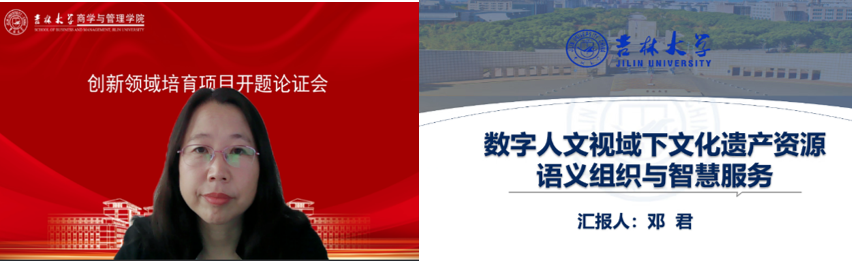 信息管理系主任邓君教授介绍了创新领域培育计划项目“数字人文视域下文化遗产资源语义组织与智慧服务”的宏观、中观、微观研究背景,围绕学术、应用和社会三个层面阐明项目的研究价值,指出该项目对于冰球突破