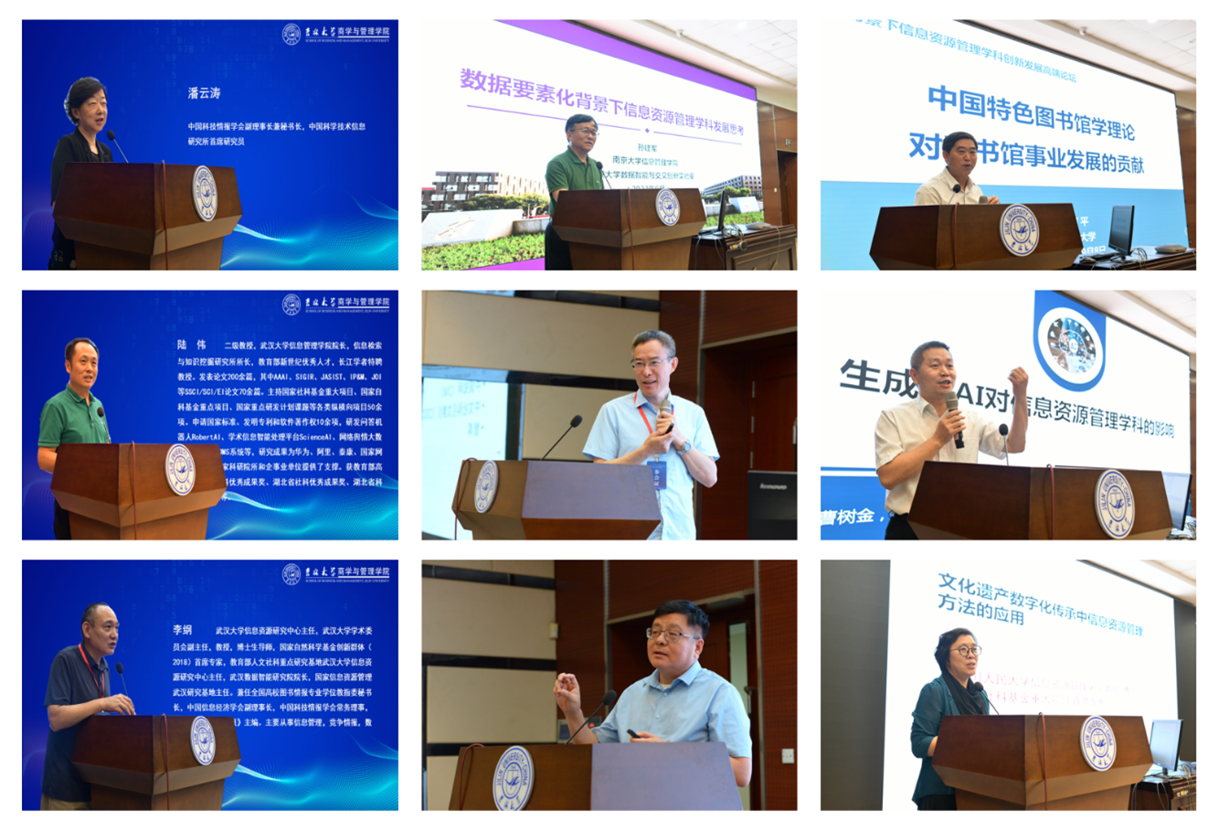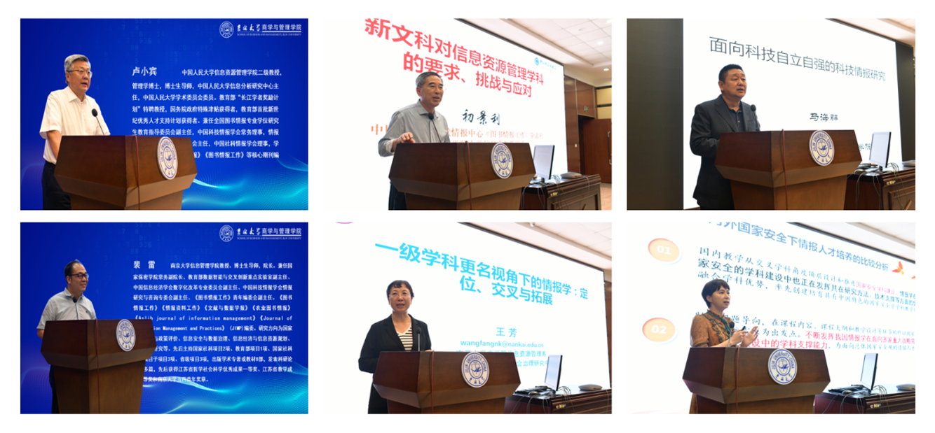 孙建军教授详细解读了数据要素化背景下信息资源管理学科的未来发展;柯平教授结合中国特色图书馆学理论对图书馆事业发展的影响,阐述图书馆学理论对其实践发展的突出贡献和重要影响;朱庆华教授梳理了信息资源管理学科发展史,并指出投入少产出大、规模小见效快和渗透广支撑强,是信息资源管理学科相较其他社会科学的突出优势和特点,也是学科未来发展应注重的方向;曹树金教授以“生成式AI对信息资源管理学科的影响”为题详细探讨信息资源管理学科在最新技术影响下的发展趋势;周庆山教授从数智技术变化入手,梳理了信息资源管理领域技术演进及其规则应对策略;周晓英教授从文化强国建设战略要求入手,探讨了图书情报方法在文化遗产数据资源建设中的应用途径及其可能性。初景利教授明确了新文科在鼓励学科交叉融合、重视技术方法应用、强调学科建设效果和支撑国家战略需要等方面的核心特征,并指出信息资源管理学科应从定位明确、课程体系设计、师资多元化、学生应用能力培养和大学科作用发挥等多方面形成独特的学科优势特色;马海群教授以“面向科技自立自强的科技情报研究”为题,突出强调新时代的情报学研究发展在学科体系、学术体系、话语体系和学术共同体等各个方面的未来潜力和发展方向;王芳教授从学科更名视角入手,阐述情报学定位、交叉与发展的未来前景;最后,王晰巍教授结合新技术发展背景下严峻的国际安全局势,论述总体国家安全观下情报人才的实际需求,就未来人才培养体系、模式和可能进行了深入分析和探讨。
