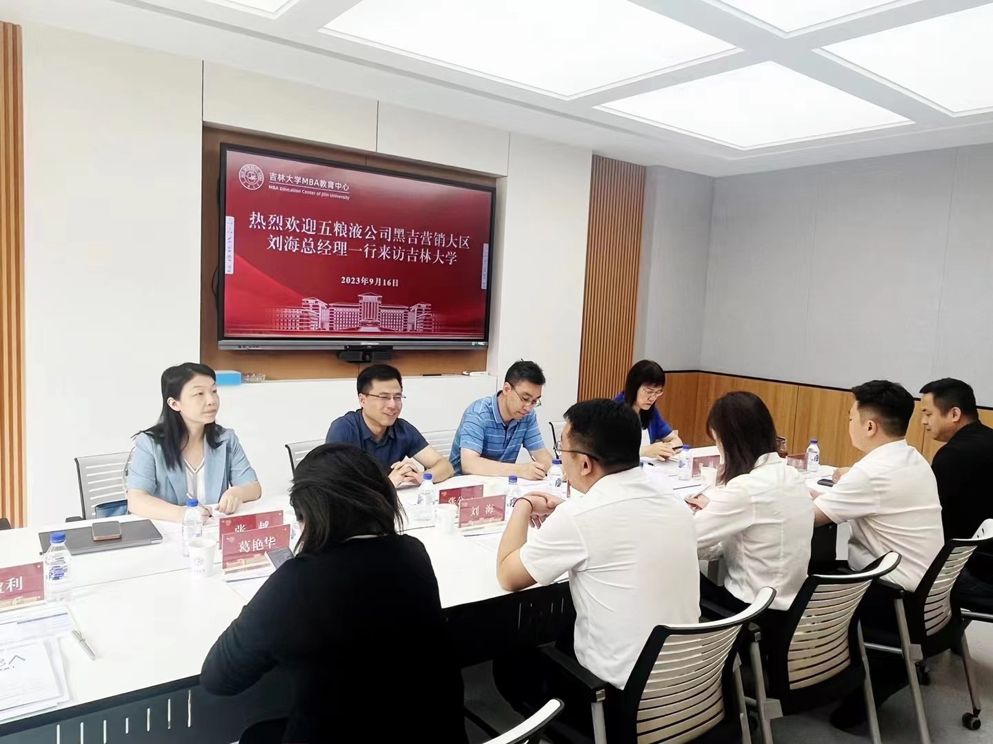 MBA教育中心,就优秀学生支持计划、案例研发、科技创新与冰球突破等议题开展座谈交流。五粮液集团黑吉营销大区总经理刘海、吉林营销总经理王艺璇、人事经理郭盈利、团购经理肖磊、千和酒业董事长葛艳华、总经理裴杰、冰球突破