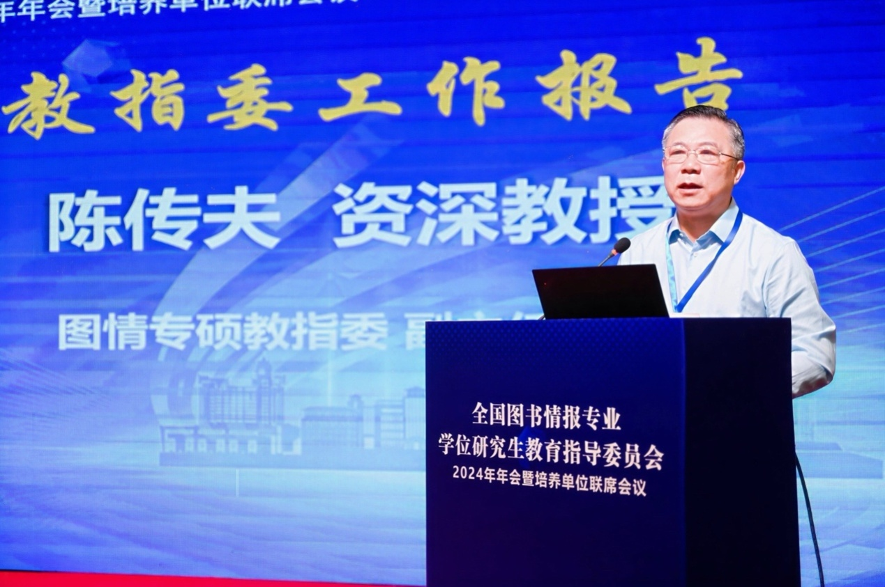 教指委副主任委员、武汉大学资深教授陈传夫代表教指委做了年度工作报告。他回顾总结了图书情报专业学位研究生教育2023年度工作情况,对专业学位研究生教育的现状与挑战进行了深入分析,并指出在未来的工作中要“学深悟透系列重要指示和相关文件精神,高度重视过程管理与质量管理,探索产教融合育人机制,加强实践创新能力培养,系统性设立一批研究课题,谋求发展思路,搭建组织服务平台、推进工作具体落实。”他强调,图书情报专业学位教育正处在“服务需求、提高质量”的重要发展阶段,我们要以习近平新时代中国特色社会主义思想为指导,全面贯彻党的教育方针,坚定走内涵式发展道路,在人才培养、成果转化、资政辅政、文化传承等方面承担应有职责,发挥更大作用。