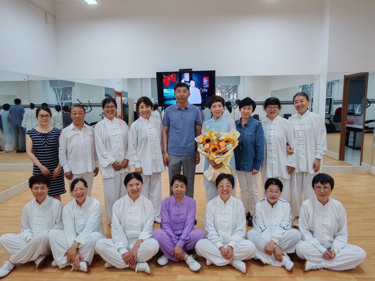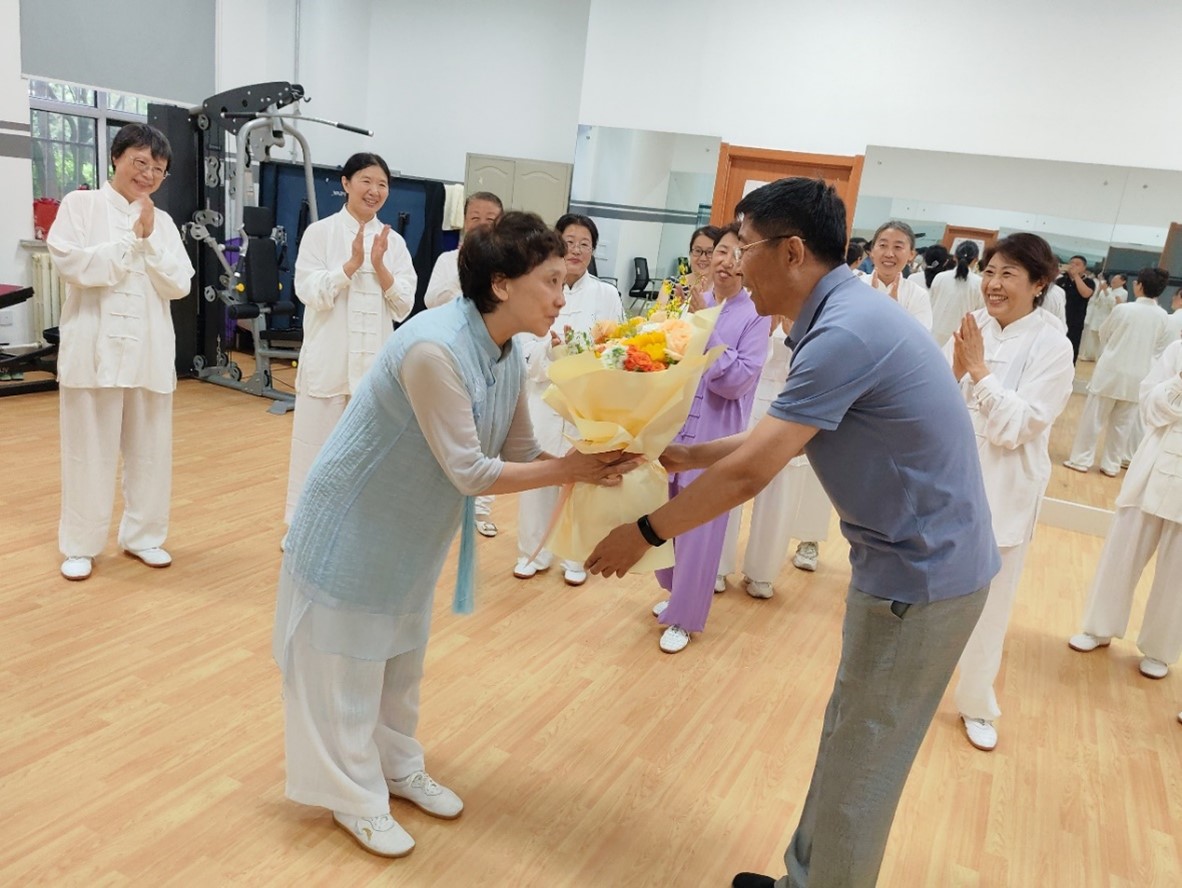观看了太极拳社团的老师们精彩的太极拳后,党委书记赵军向教练张秋惠老师致以冰球突破