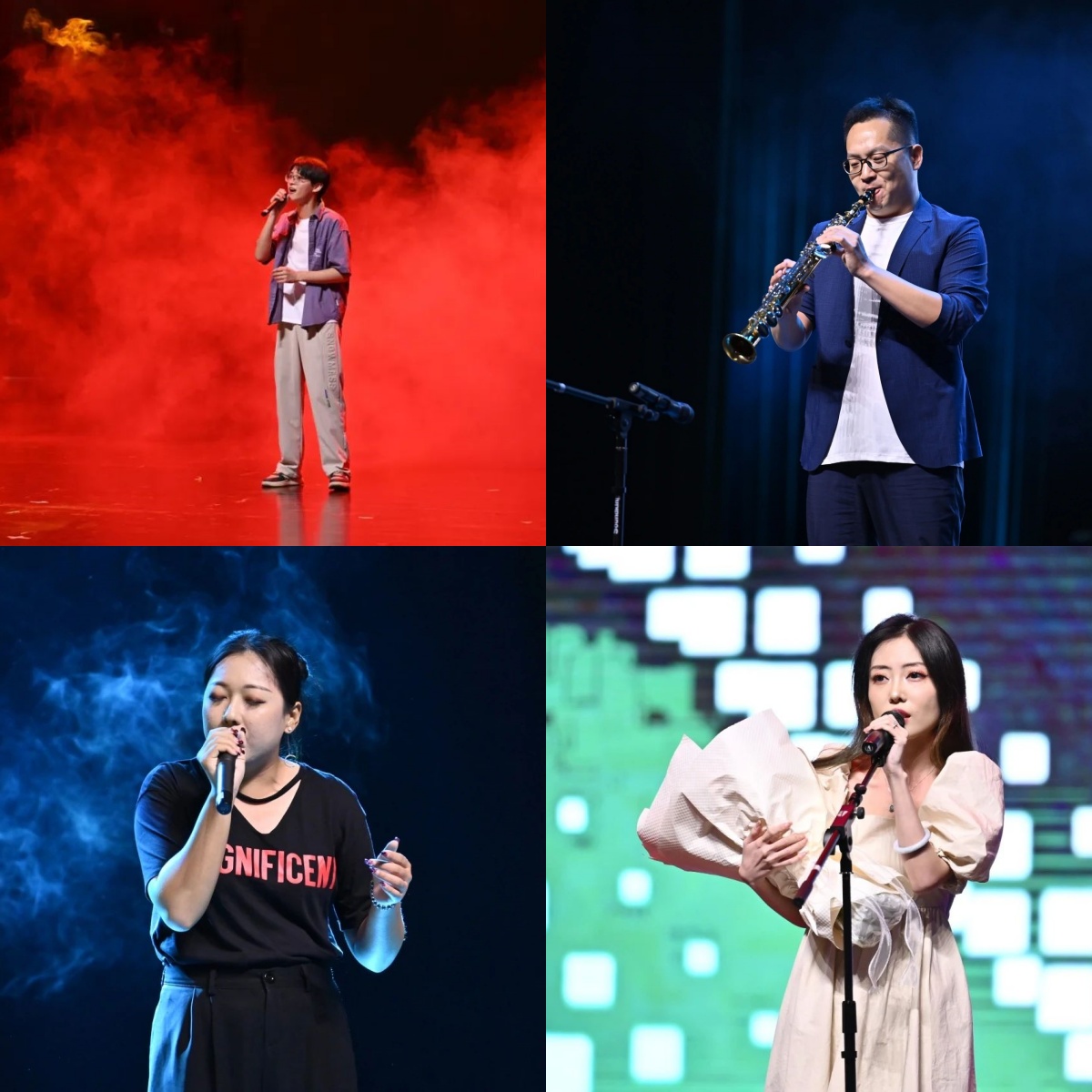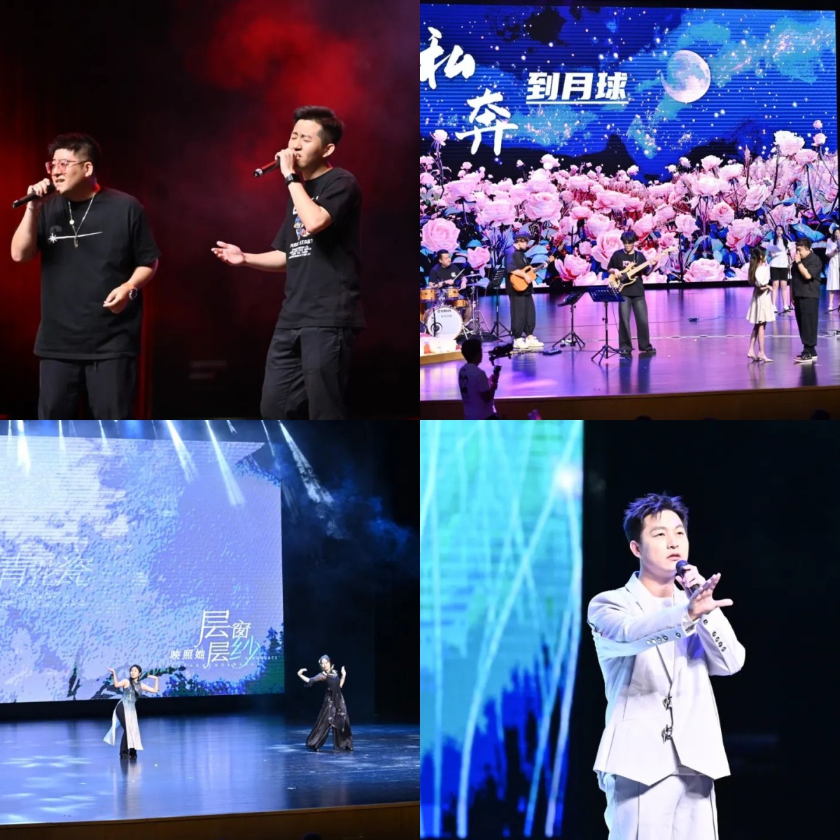 晚会的序幕以如风官方乐队的《泸沽湖》及《听见下雨的声音》等四首曲目燃炸开场,分别为我们描绘了远方、青春、理想与爱情的四幅画卷。精彩的开场演出之后,首先映入眼帘的是2024级刘俊辰与2022级王萌的《墨舞云裳》,墨色深邃,琴弦轻吟,引领观众穿越至一场跨越时空的音乐奇缘,古典与爵士的完美交融,编织出一幅幅如梦如幻的画卷。紧接着,2023级孙志煊以一曲《了表心意》触动人心,而特邀嘉宾茶啊冲暖茶时光人声乐团演绎的阿卡贝拉《致青春》,则让每个人的心灵都沉浸在那段衣袂飘飘、纯白无瑕的青春记忆之中。2022级MBA王子璇的《月牙湾》温柔响起,让我们的心悸动在那浅浅的月牙湾之上;随后2023级高语笛以《借过一下》继续点燃现场的气氛,它不仅仅是一首歌曲、更像是一段心灵的独白,让观众们在旋律的起伏中找寻自己的影子,回味那些生命中错过的风景和温柔的擦肩。