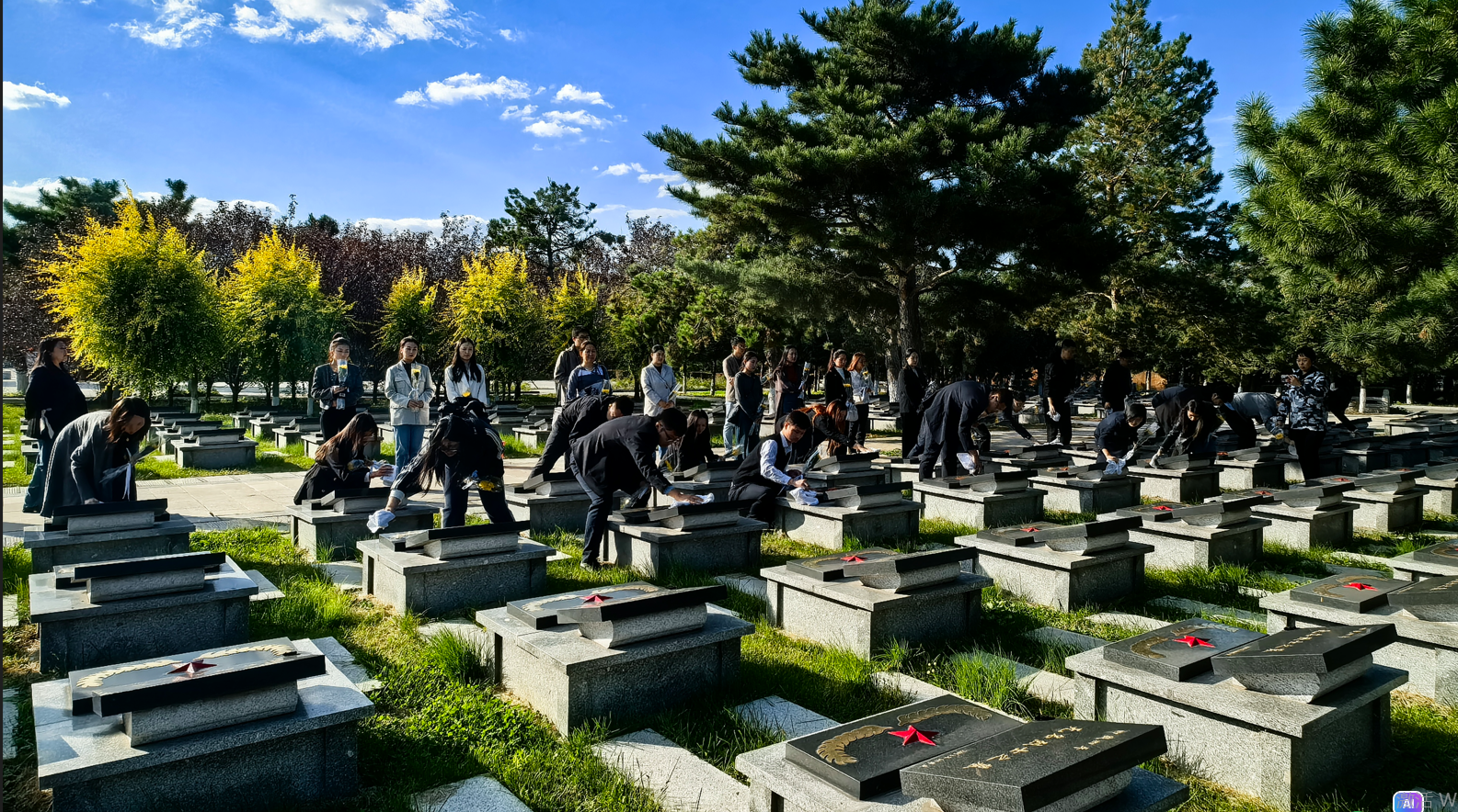 全体师生肃立在烈士墓碑前,举行了庄严的祭奠仪式,全体鞠躬默哀并向烈士敬献了花篮,表达对先烈的崇高敬意和深切怀念。主持人回顾了先烈们的英勇事迹和丰功伟绩,号召大家要铭记历史、珍惜和平、奋发向前。