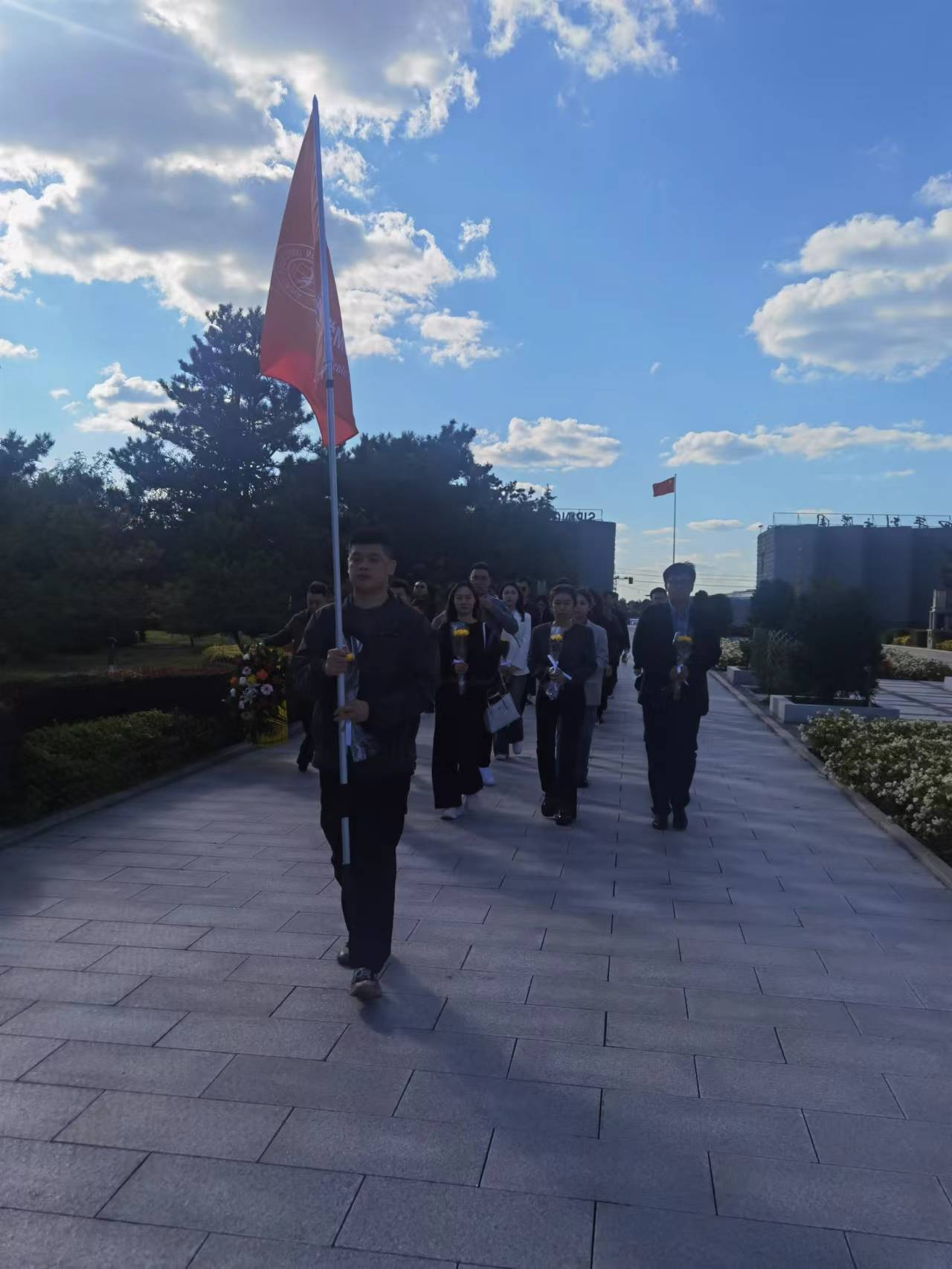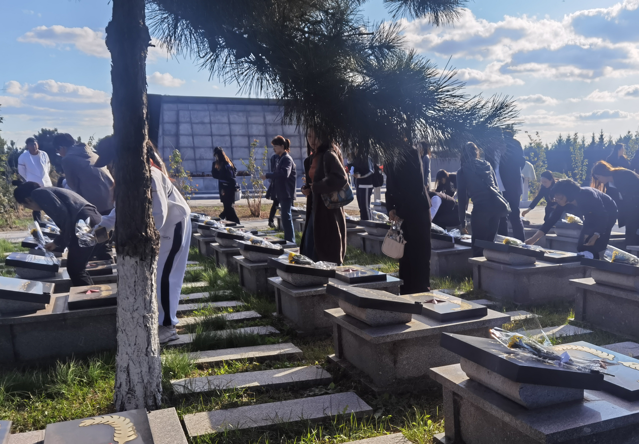 最后,同学们来到四平烈士陵园祭扫追思,缅怀在四平战役中牺牲的革命先烈。烈士陵园作为纪念革命先烈的重要场所,承载着厚重的历史记忆和民族精神。园内庄严肃穆,烈士纪念碑矗立入云,仿佛在诉说着那段波澜壮阔的革命历程。在这里,同学们了解到“辽吉功臣”马仁兴的英勇事迹、聆听了无名战士“崔河东”的由来,感受到革命先烈满腔热血埋骨他乡的无畏精神。