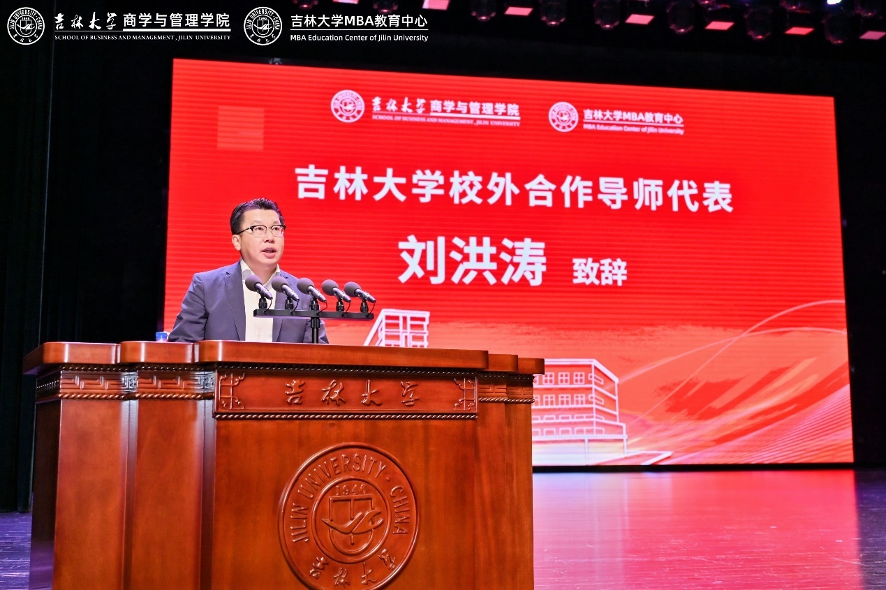 兴业银行股份有限公司长春一汽支行行长刘洪涛先生代表校外合作导师致辞,他鼓励同学们勇于探索、追求真理,勤奋学习、厚积薄发,团结协作、共同成长。