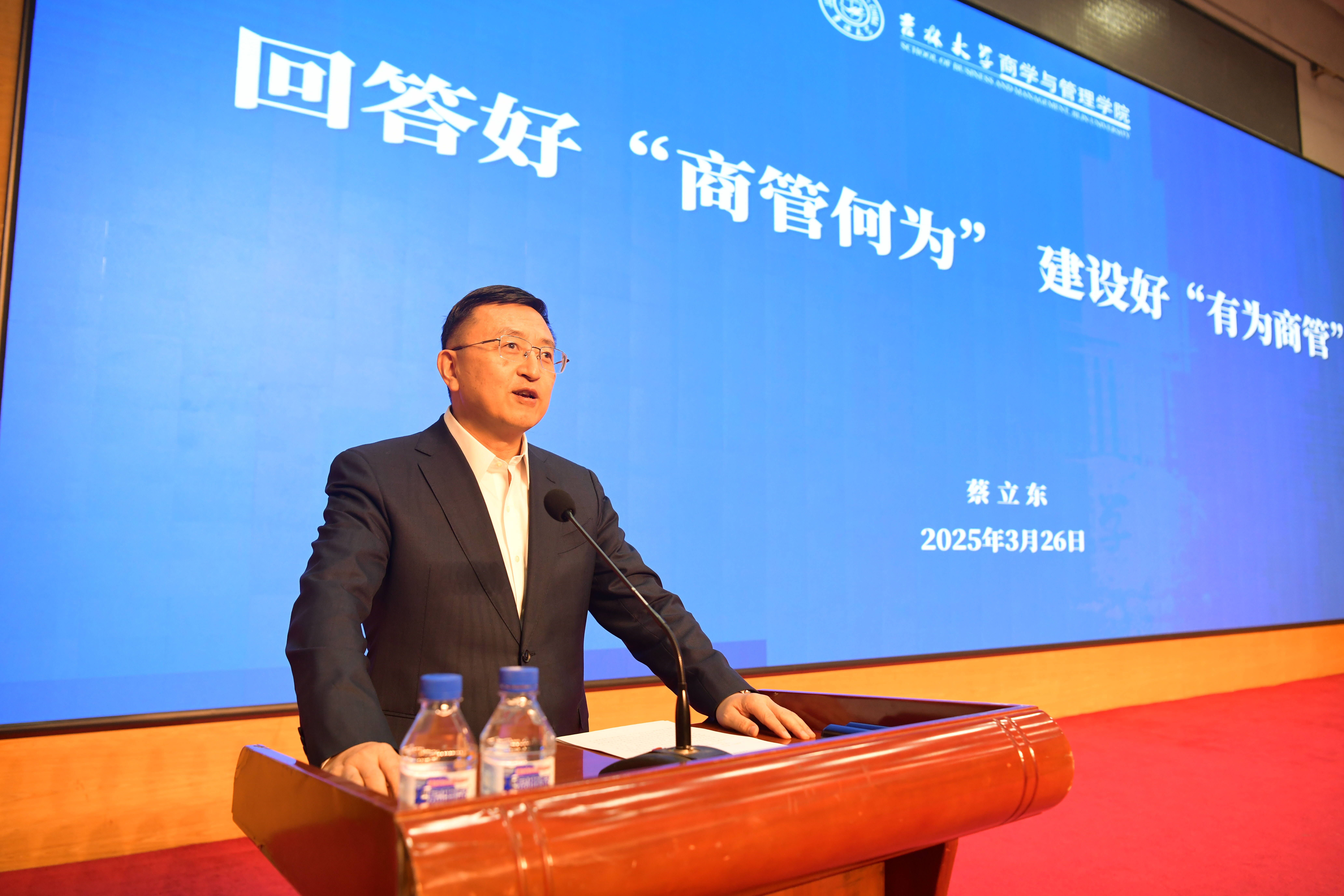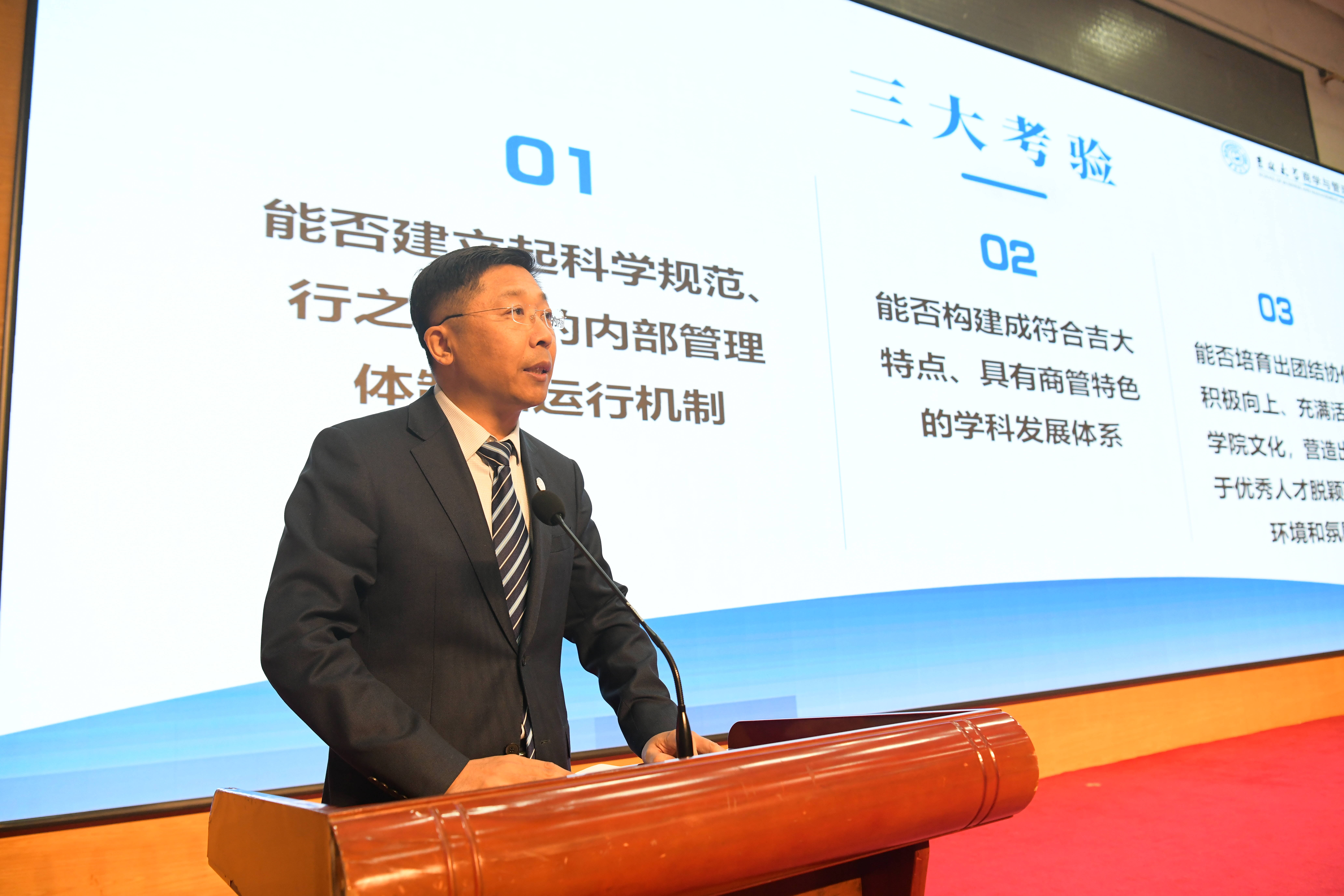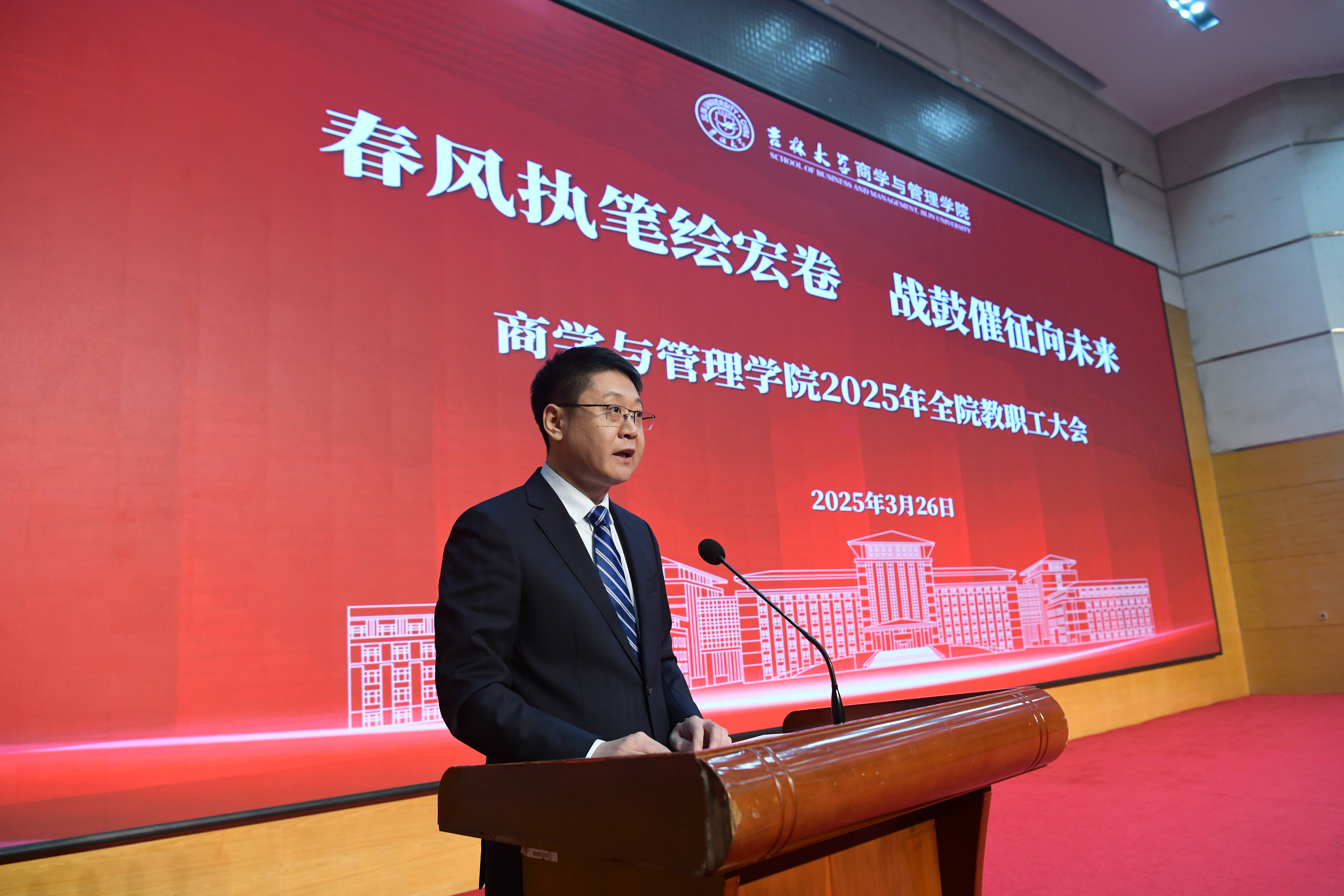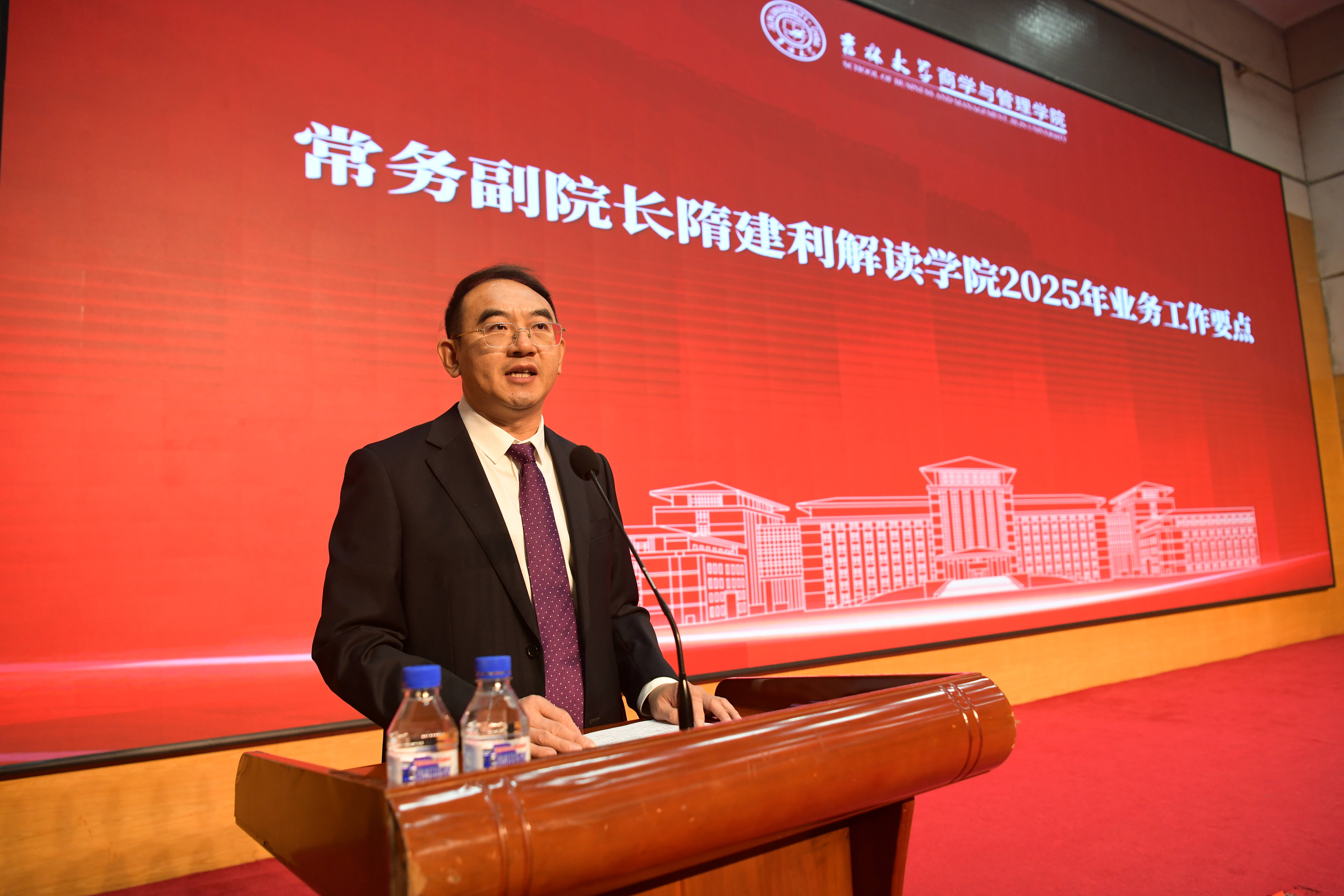 过去一年取得的成绩给予了充分肯定,对2025年的具体工作进行了强调部署。蔡校长指出:建设“有为商管”需要始终坚定奋斗方向,一马当先“争上游”;需要始终扭住奋斗关键,一以贯之“重合作”;需要始终保持奋斗情怀,一如既往“提士气”;更需要始终紧盯奋斗目标,一丝不苟“促发展”。商管人回首过去,是在用“赶考”之心向历史致敬;商管人展望未来,更是在用“赶考”之行对历史负责。希望全体商管人以“六个坚持”为引领,回答好“商管何为”,以“四个重点”为突破,建设好“有为商管”。