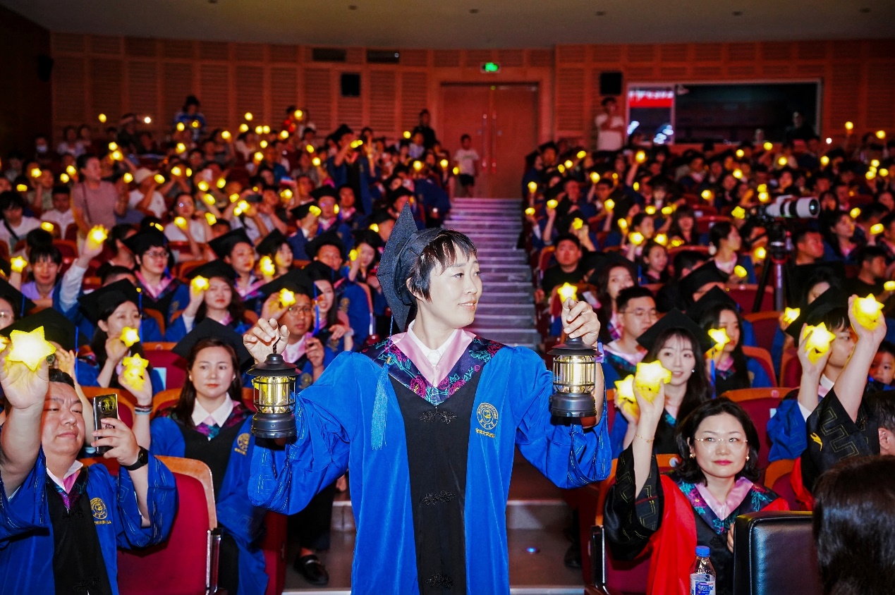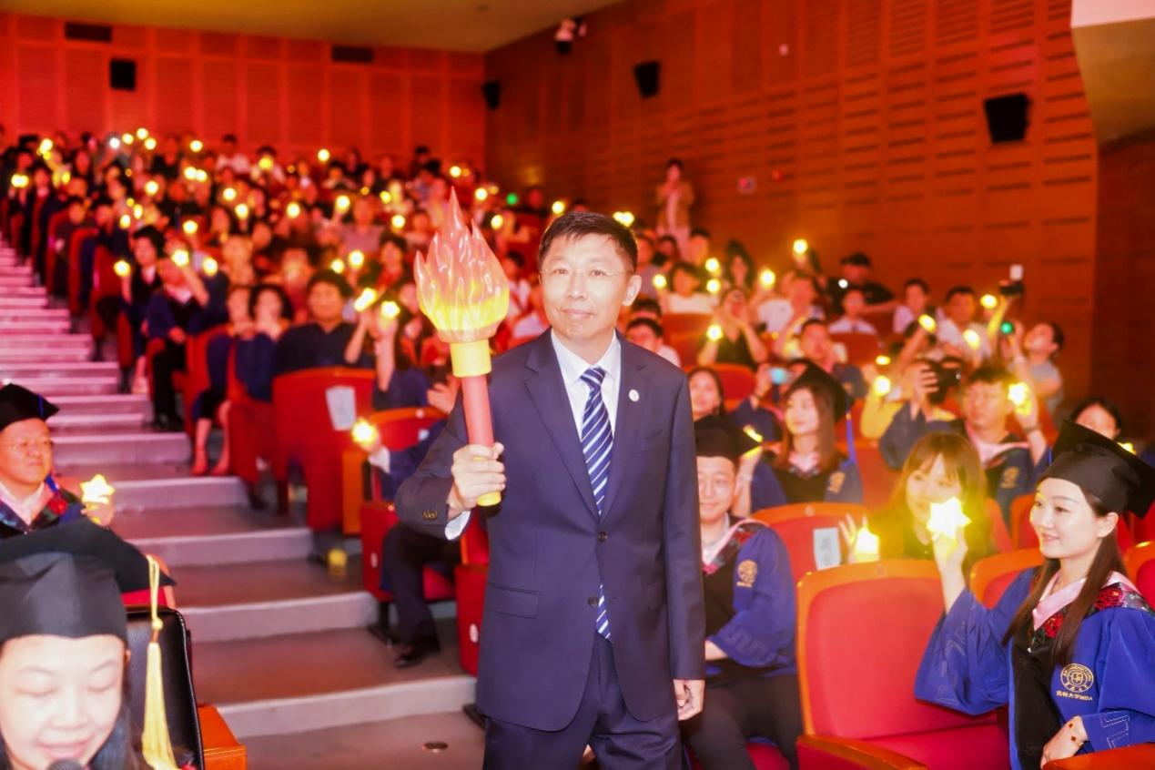 党委书记赵军教授高擎象征吉大精神传承的火炬引领入场,毕业生代表温宏娜手捧“心灵之灯”紧随其后。当火炬在舞台交汇,全场学子点亮腕间星星灯,霎时星河璀璨。