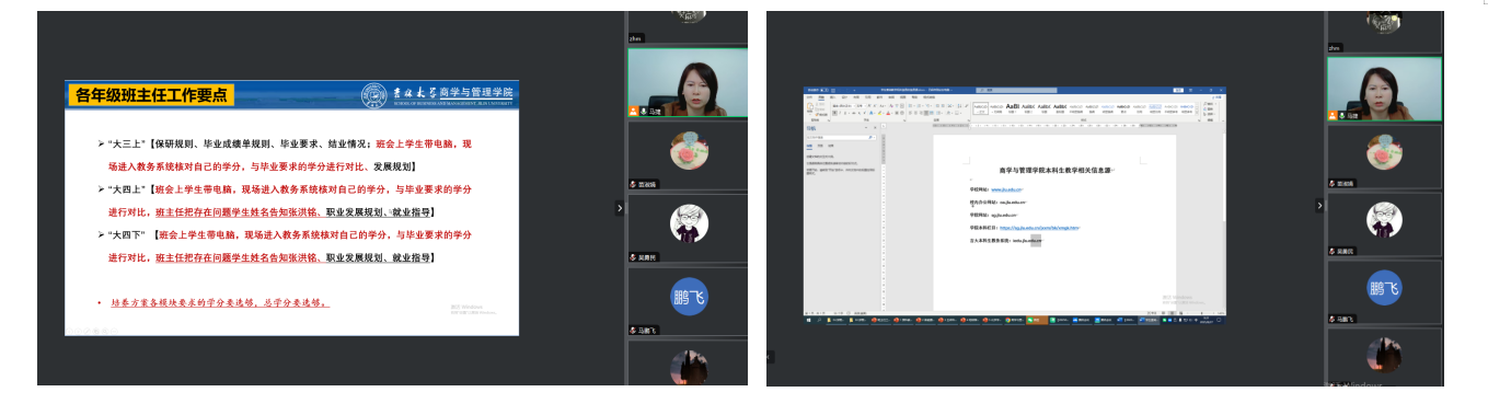 本科生工作管理办法》等相关制度文件,强调了本科生班主任要认真履行岗位职责,关怀学生成长,及时传达和解读培养方案和教学各环节制度,引导学生投身科研与创新训练活动,为其提供全面的学业发展与职业规划指导。针对大一至大四年级学生在不同学习阶段的侧重点,对相应年级的班主任布置了班会上要重点传达和指导的工作内容,包括培养方案解读、分流与转专业政策说明、外出实习要求、保研政策说明、毕业相关规则、职业发展规划指导以及科研与创新创业训练活动等各方面,并分享了优秀班主任的一些成功工作经验。随后,与会教师就学习困难学生帮扶、保研政策解读、科研训练、班主任工作具体开展方式等问题进行交流讨论。