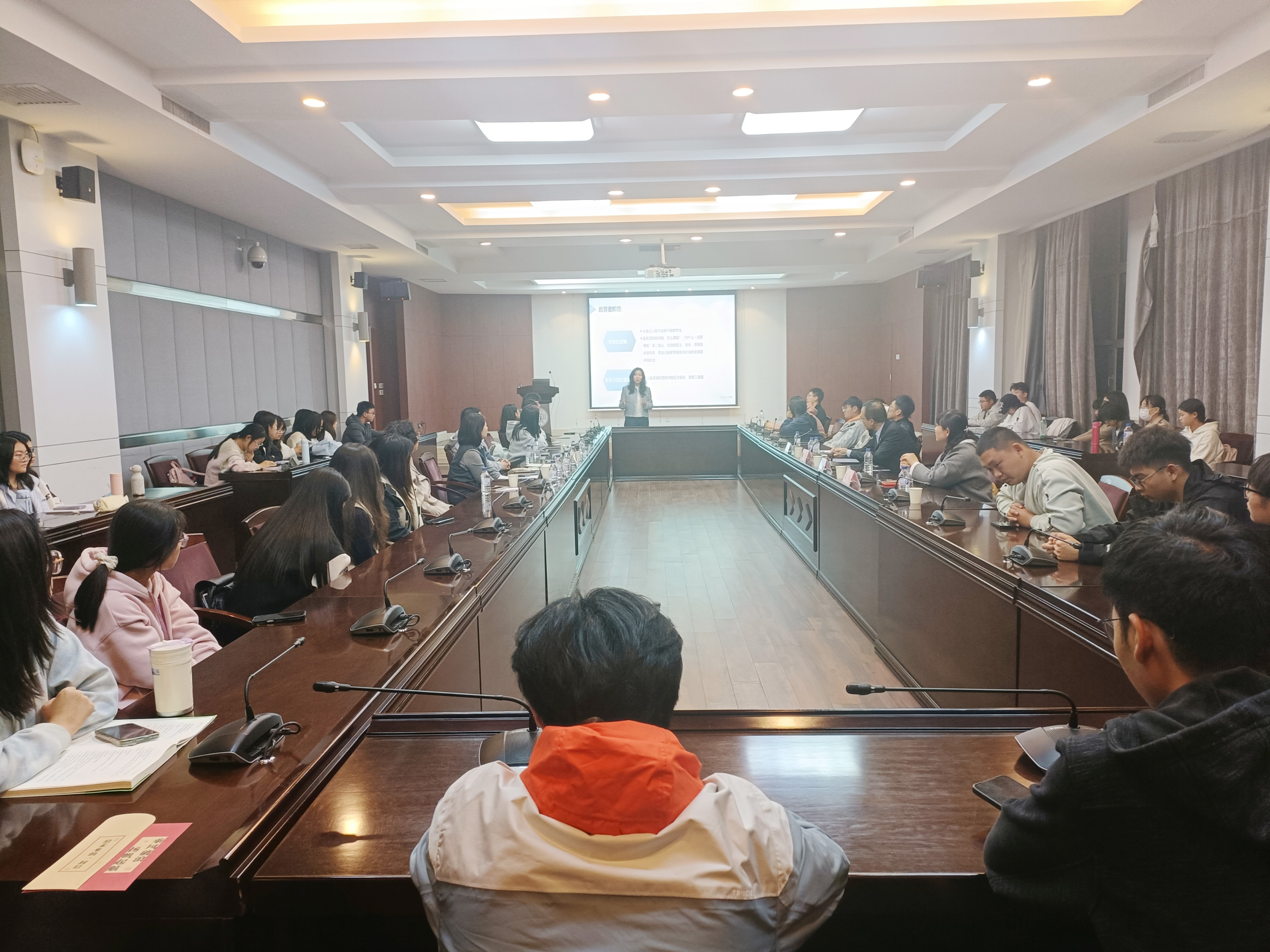 对王老师的到来表示热烈的欢迎。随后,王勇老师结合个人职业发展历程,围绕大学求学、公务员、律师及教育创业者四个阶段展开分享,系统阐述了在商法融合背景下的实践思考与成长感悟。他从工作与学习双重视角出发,为在场同学们提出以下核心建议:在专业学习上,应拓宽知识边界,注重培养自学能力与主动担当的精神;在学习方法上,王老师将学习概括为十字经验,即“读书、思考、交流、实践、自学”,强调学习应超越应试,实现内化于心、外化于行;在职业规划上,王老师倡导“将个人内驱力与社会普遍需求相结合”,理性选择行业赛道,应不断向内探索,明晰真实需求,以内在动力驱动行为选择,持续学习与思考;在人生决策上,应以未来期望为导向,避免陷入线性思维的陷阱;在认知构建上,王老师强调个人认知的突破有赖于持续且主动的自我训练,学生应有意识地与高认知人士交流、刻意练习写作能力,在思想碰撞中汲取智慧,通过系统性的文字输出梳理思想。