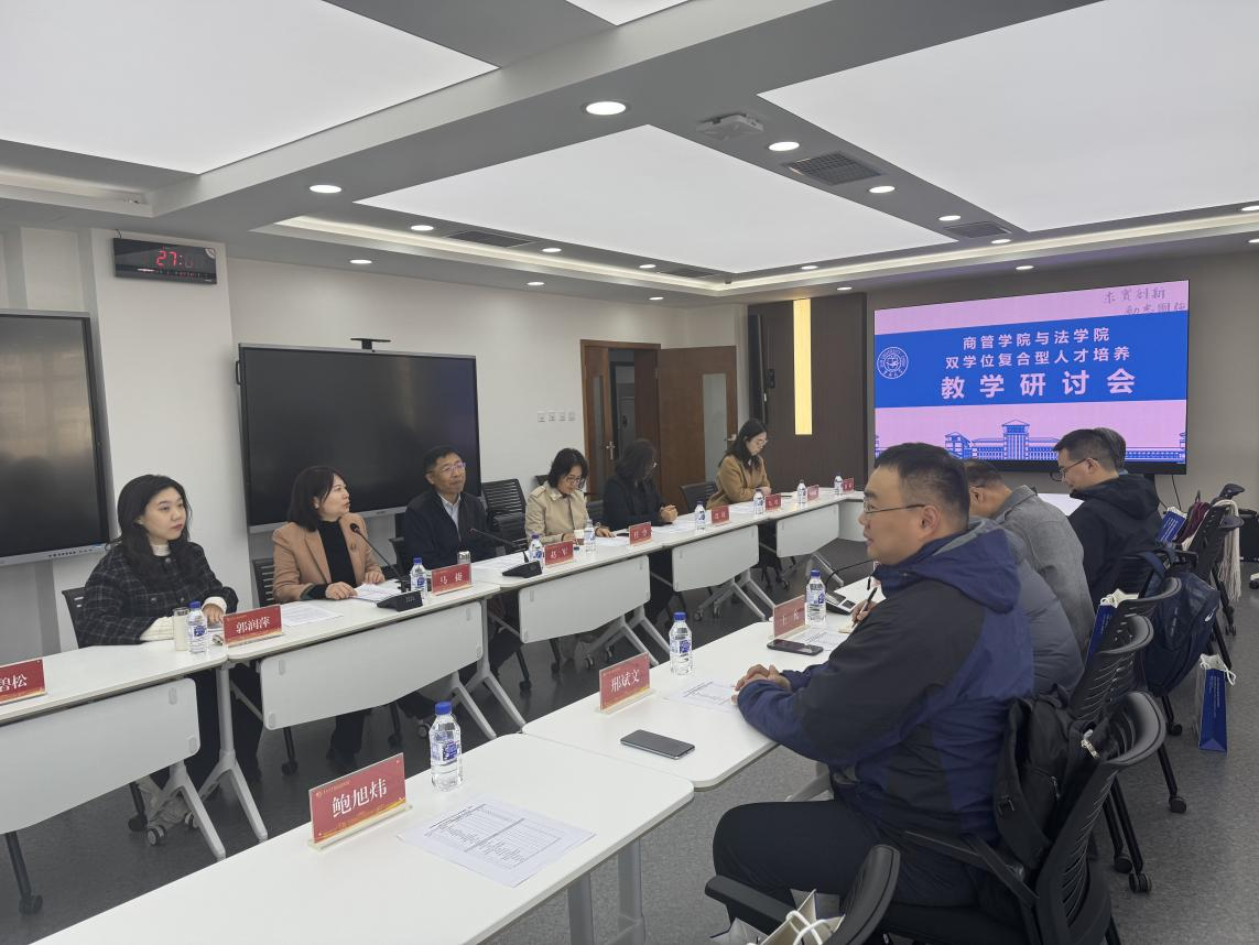 刘雪斌教授就法学人才核心素质与关键能力培养这一议题阐述了观点,强调思维训练与能力构建在法学教育中的重要地位。技术经济系主任郭润萍教授结合赴中国人民大学等高校的调研成果,介绍了双学位人才培养的基本思路与实施路径,并从课程体系、教学组织与实践环节等方面提出具体建议。颜毅艺老师结合“企业法务”提出双学位人才培养的三点思考:教学内容应从“知识灌输”转向“实践智慧”,开发模拟场景课程提升学生实战能力;人才定位应从“商业配角”转向“规则设计师”,以法律智慧助力商业创新;应聚焦AI时代的价值判断力,锤炼学生在复杂情境中的决策能力。颜毅艺老师的分享引起任伶老师的共鸣,她结合自己承担的课程提出了应关注双学位复合型人才能力和素质的培养。曾韬老师从课程建设角度出发,建议在教学中强化“政企关系与政府监管”等专题模块,提议两院教师共同开发相关案例库,帮助学生构建起法律规范与商业实践之间的系统性认知。邢斌文老师则从实践教学出发,提出可将合宪性审查等热点案例融入课堂,引导学生将法律规范与社会现实相连接,锻炼其法律解释与适用能力。沈旺老师结合“机器学习”课程,提出面向双学位学生教学将进行专门的案例开发与设计,在运用数智技术助力法学领域问题解决的层面上加强教学设计。结合冰球突破