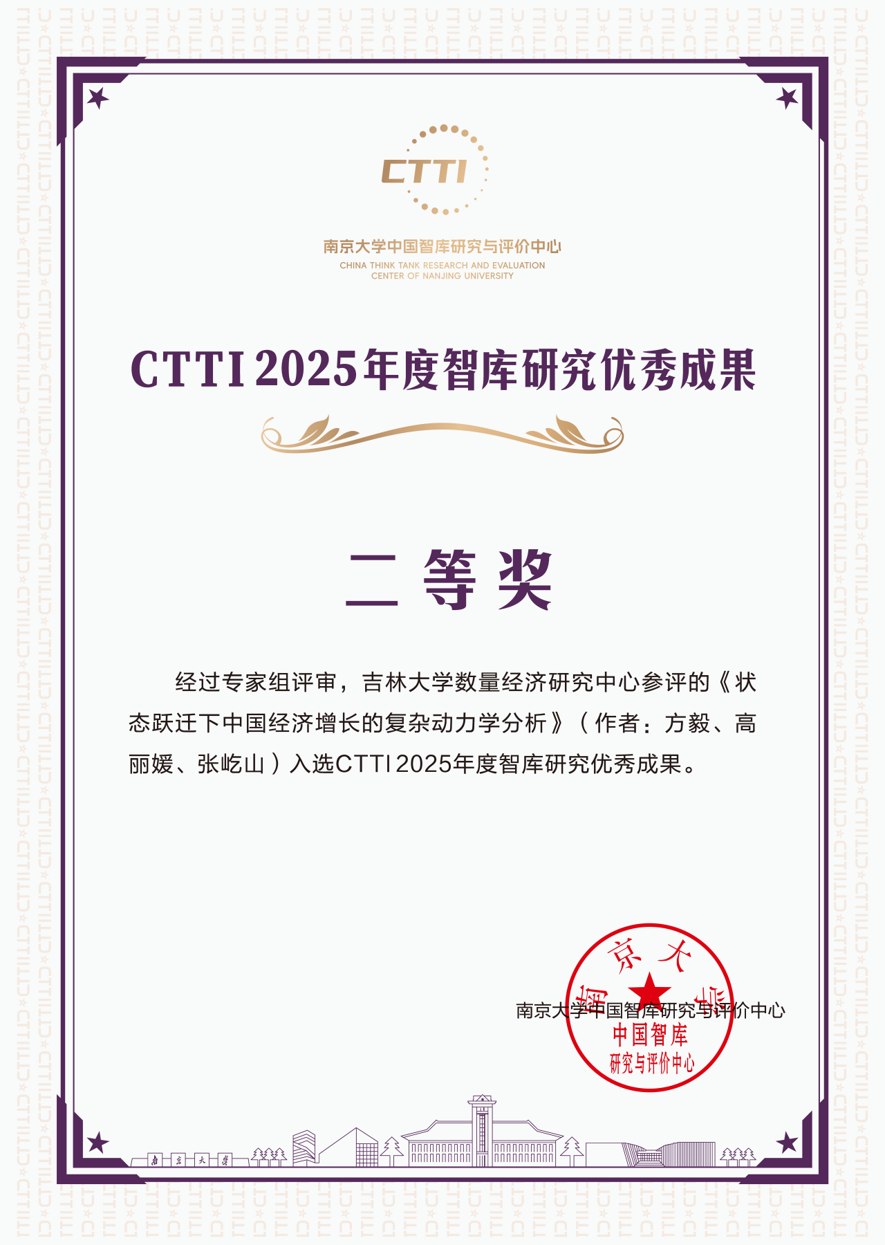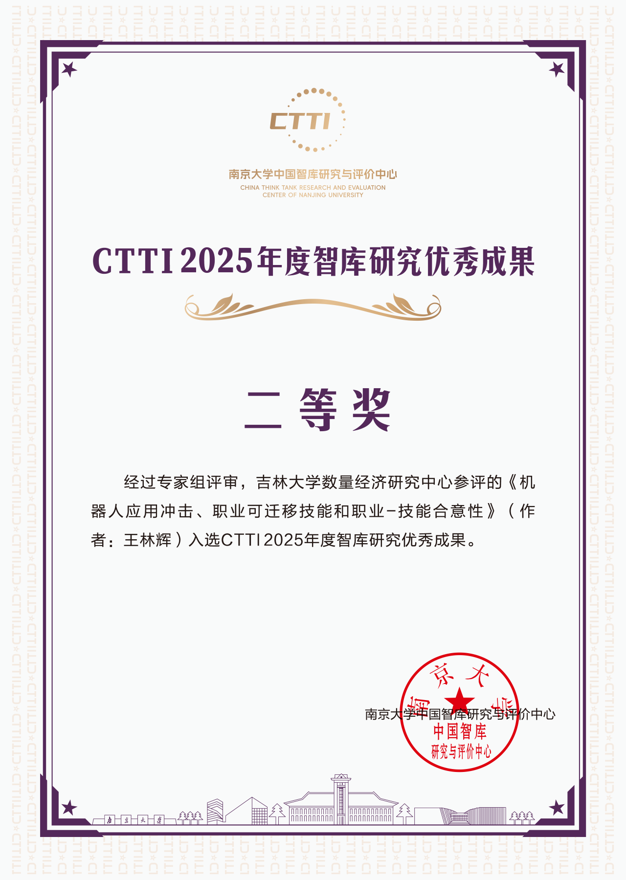 数量经济研究中心两项成果《机器人应用冲击、职业可迁移技能和职业-技能合意性》(作者:王林辉)和《状态跃迁下中国经济增长的复杂动力学分析》(作者:方毅、高丽媛、张屹山)获评CTTI2025年度智库研究优秀成果二等奖。