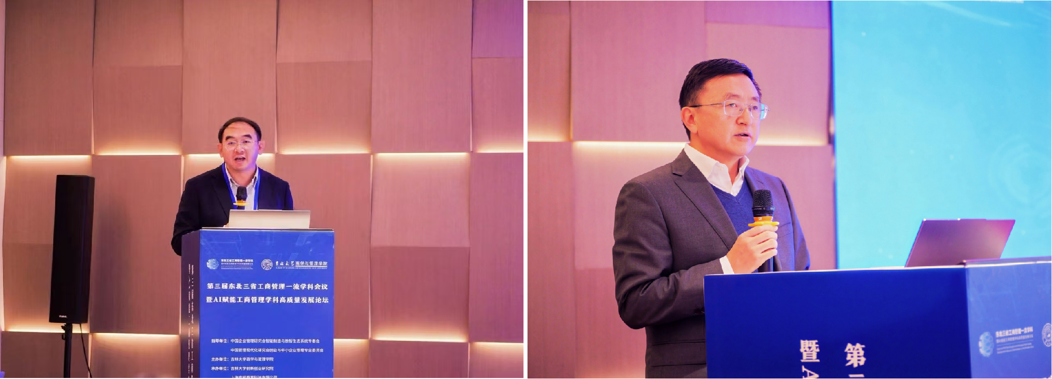 院长蔡立东教授致辞。蔡立东教授对参会人员表示欢迎,祝贺第三届东北三省工商管理一流学科会议成功举办,并感谢兄弟院校支持。他指出,工商管理学科在新时代国家战略中具有重要地位,而以AI为代表的技术变革带来了新的机遇与挑战。本届会议以此为主题,恰逢其时。他希望会议能够搭建思想交流平台,解答AI时代工商管理学科发展的关键问题。