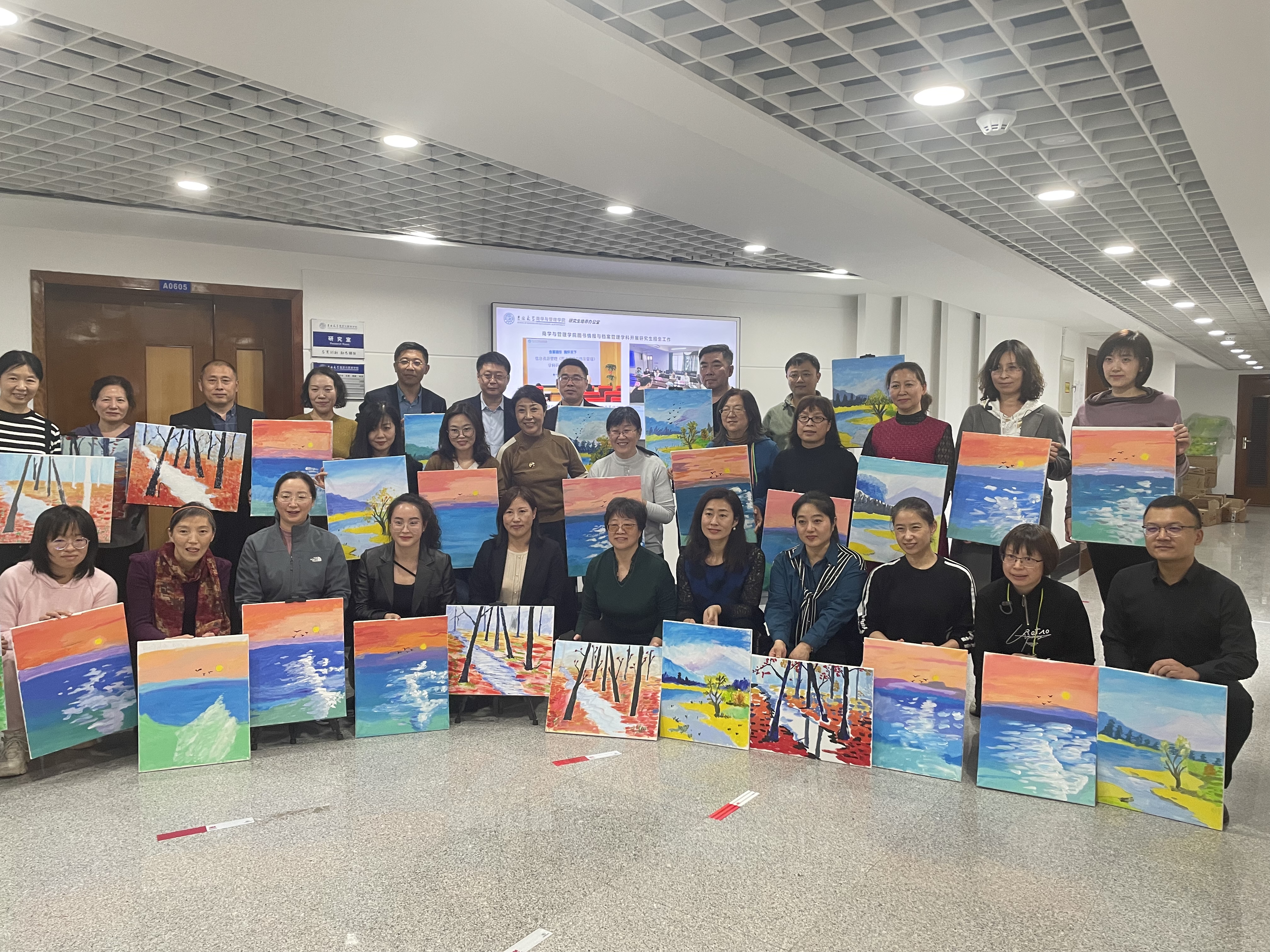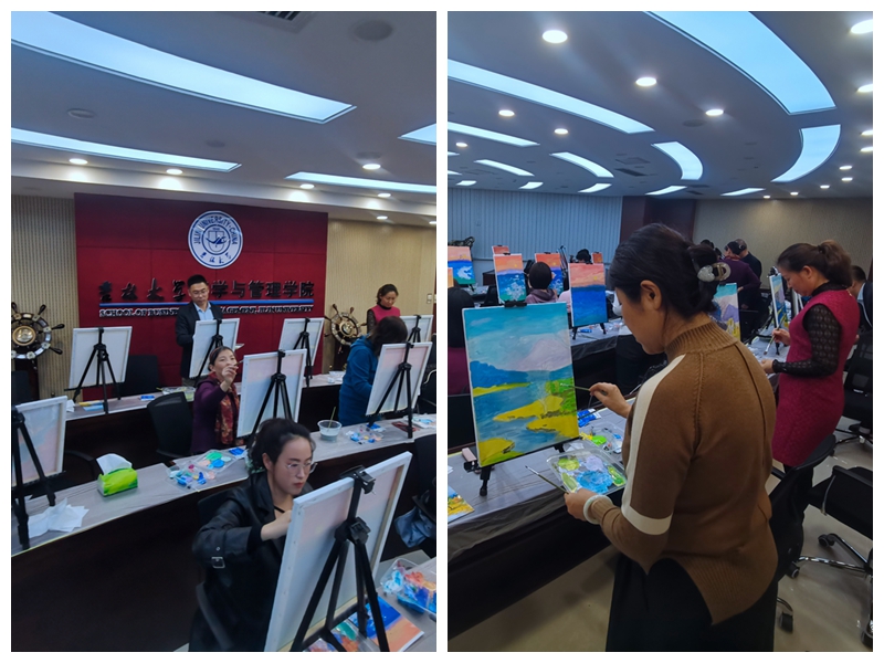 邀请到了中国青年艺术家、画家,吉林美术家协会会员史英武老师团队担任活动艺术指导。首先,史老师从画面构图、色彩调和、落笔次序、画笔使用等方面介绍了油画基础知识和绘画技巧,并就“湖光山色”“海上日出”“层林尽染”三个绘画主题进行详细讲解。随后,老师们纷纷拿起画笔,全身心投入到油画创作中。从大胆调色、精心上色到细致勾勒,大家时而专心绘制,时而相互切磋,手中的画笔仿佛唤醒了心中尘封已久的追寻艺术的梦想。两个小时的欢声笑语中,一幅幅匠心独具的作品逐渐鲜活地跃然于画布之上,凝结着艺术的巧思与和谐的自然之美,彰显着冰球突破