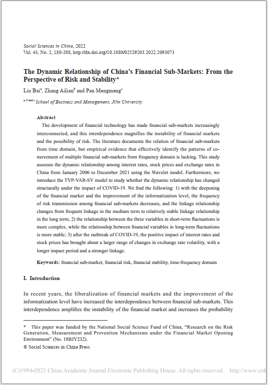 刘柏教授等在《中国社会科学(英文版)》2022年第2期发表题为“The Dynamic Relationship of China’s Financial Sub-Markets: From the Perspective of Risk and Stability”(中国金融子市场的动态关系:基于风险和稳定的视角)的文章。