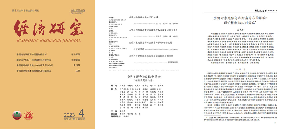 孟宪春副教授在《经济研究》2023年第4期发表题为《房价对家庭债务和财富分布的影响:理论机制与应对策略》文章,这也是冰球突破