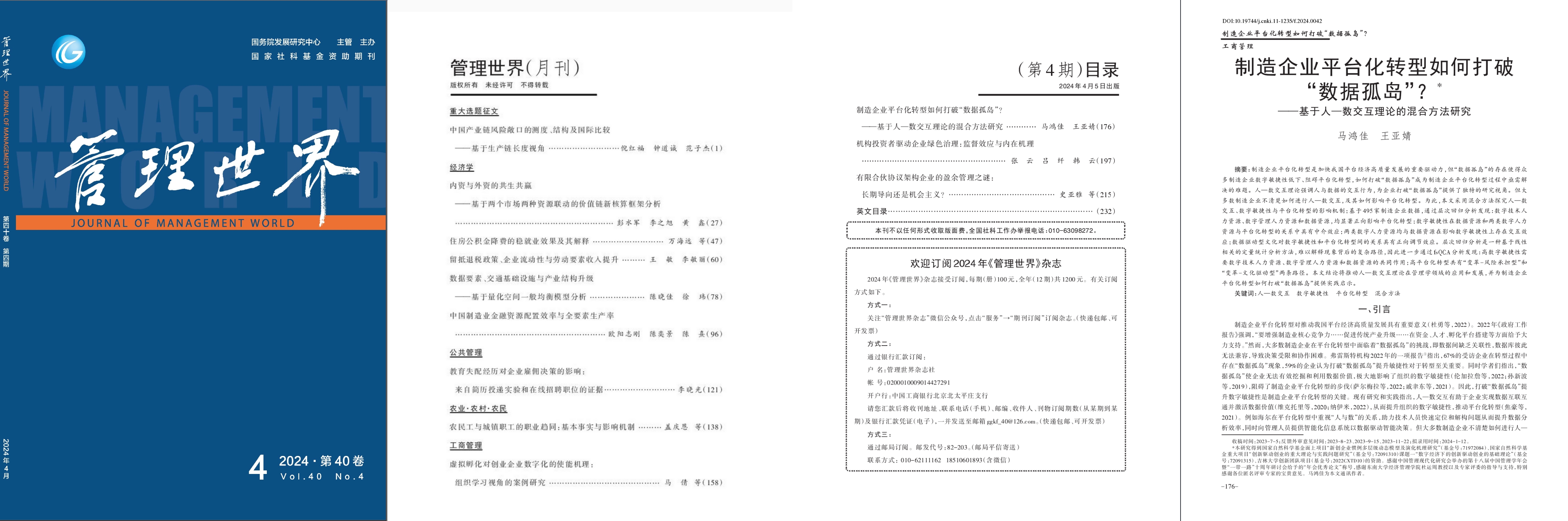 马鸿佳教授等在《管理世界》2024年第4期发表题为《制造企业平台化转型如何打破“数据孤岛”?——基于人—数交互理论的混合方法研究》的文章。该文紧扣数字经济时代下如何打破“数据孤岛”发挥数据价值这一关键问题,基于人-数交互理论,创新性地采用混合方法,揭示了制造企业平台化转型路径。