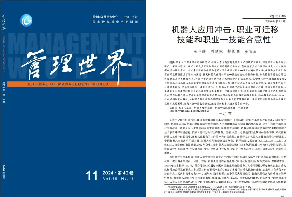董直庆教授的合作论文“机器人应用冲击、职业可迁移技能和职业—技能合意性”发表于《管理世界》2024年第11期。