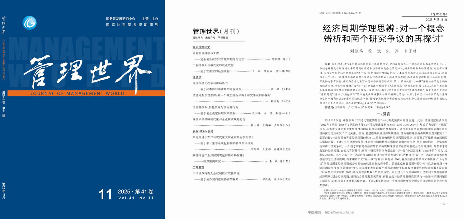 刘达禹教授以第一作者身份撰写的题为《经济周期学理思辨:对一个概念辨析和两个研究争议的再探讨》的理论研究论文在《管理世界》2025年第11期正式发表。文章解答了长期困扰经济周期研究的三个基本问题。其中,一个概念辨析是指经济增长率的周期性波动和经济周期成分之间的辨析;而两个研究争议则分别是指“谷-谷”分割困境与“Uhlig争议”。
