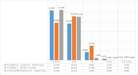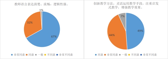 在教学方法方面,大部分教师授课语言表达清楚、流畅,逻辑性强。建议教师多在授课过程中灵活运用教学手段,多进行启发式教学。尽量避免简单叙述的教学方法,可通过播放视频、分组讨论、实例讲解等多种方式,进一步加强课堂的活动设计,提高学生参与度。同时教师应当积极转换教学观念,由原来的传授知识转变为让学生积极主动地探索知识,让学生参与到教学过程中来,充分调动学生的主观能动性。