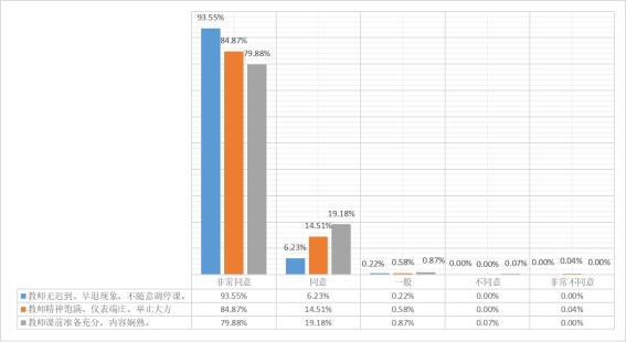 提交的评课记录数据统计,教学态度方面评价较高,教师能够做到守时守规,不随意调停课,上课精神饱满,课前准备充分,授课娴熟,教案、教具完备。教师良好的教学态度能很好地提升学生的学习积极性和学习效果,提高课堂教学效率。