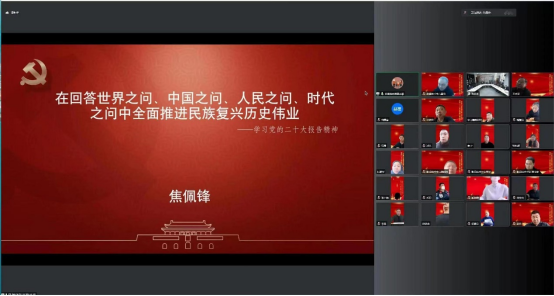焦佩锋教授以“在回答中国之问、世界之问、人民之问、时代之问中全面推进民族复兴的历史伟业——学习党的二十大报告精神”为题目,从中国之问与坚持和发展中国特色社会主义、人民之问与坚持以人民为中心的发展思想、世界之问与推动构建人类命运共同体、时代之问与走中国式现代化道路创造人类文明新形态等四个方面进行了讲授。整个讲座以双重逻辑的角度分析讲解了二十大报告的精髓,从横向逻辑的视角,以回答中国之问、世界之问、人民之问、时代之问去诠释二十大报告的精神;纵向逻辑则重点梳理了从十八大、十九大到二十大,这样一个历史递进的过程,通过对比分析来阐明二十大报告中全新的提法和理念,横向逻辑与纵向逻辑相结合,以报告为纲以时间为线,全方位清晰阐明了二十大报告的精神实质。