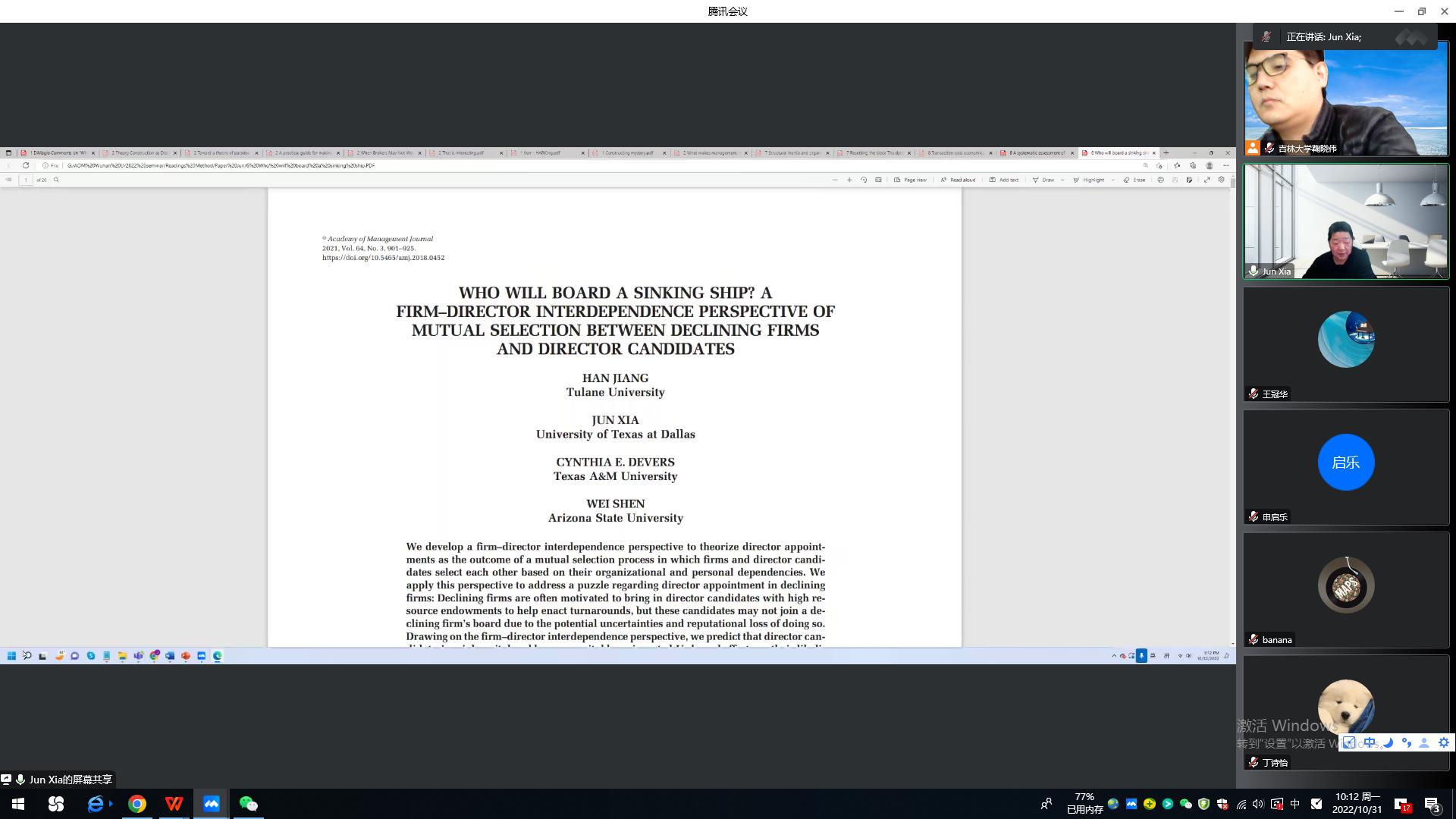第一场讲座题目为“Research design: Experience sharing”。本次讲座围绕“sense making”的主题展开。讲座开始,夏军教授对在场师生提出 “什么是理论”“什么不是理论”的问题。通过对具体文章主体结构的分析与回顾,夏军教授指出,其实对于现有文章中的“理论”都是真正理论的代理,而真正的理论实际是无法描述的,现有的“理论”只能尽可能的“接近”它。夏军教授通过列举一些古希腊罗马哲学的例子来帮助听众更好地理解这个问题。另外,夏军教授强调了在文章写作中,所写的理论部分一定要具有普遍化,这样才能有助于文章发表在更好的期刊中。