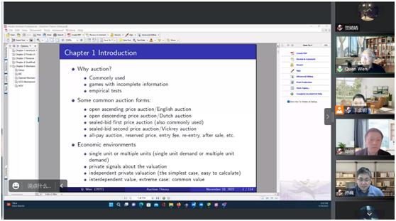 师生带来两场学术盛宴。讲座由数量经济系孙巍教授主持,数量经济系部分教师、研究生和本科生参与了学术活动。第一场讲座题目为“Auction theory”,围绕“The results of classical auction theory”的主题,温泉教授首先介绍了“Auction theory”的基本内容,从 “Why auction”、“Some common auction forms”和“Economic environments”三个方面展开。此外,温泉教授详细介绍了常见的拍卖模型“Private value auctions”,从模型的基本假设入手,介绍了模型的设定、具体形式并展示了最后结果。第二场讲座是第一场讲座内容的实证应用,围绕温泉教授发表的文章展开。这篇文章以我国各大城市车牌分配限制方式不同为背景,对广州汽车牌照hybrid分配方式进行分析,基于现实数据进行模型设定和均衡分析,探讨“auction-lottery hybrid mechanism”是否可以兼顾效率和公平。两场讲座中,温泉教授详尽讲述了理论知识和实践应用两部分,极大的激发了大家钻研理论并付诸实践应用的科研热情。讲座过程中,温泉教授与冰球突破