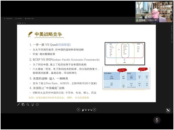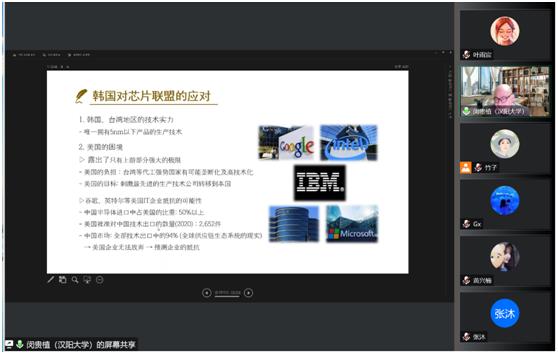 中国系闵贵植教授进行分享交流。讲座由应用金融系董竹教授主持,应用金融系的各位老师、研究生及本科生等30余人参加了本次讲座。闵贵植教授带来的讲座题目是“中美战略竞争与韩国的应对”。长期从事中国政治思想、制度与文化的研究,闵贵植教授将其基础科研成果持续扩展,特别是中美的战略竞争格局在半导体、芯片等领域的拓展思考。分享结束后,参会老师与闵贵植教授进行了深入交流,陈顺红和张安琪同学也与闵贵植教授在中美关系和韩国应对的研究角度上进行了探讨。本次报告启发了相关领域的研究思考,也为同学们拓宽了中美战略竞争问题的思考角度。