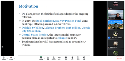 Jeffery Yu副教授,财务管理系刘柏教授主持了本次讲座,财务管理系师生等参与了本次学术交流。Jeffery Yu教授讲座题目是:Risk Shifting within the Firm: The Effect of Policy Uncertainty on Corporate Pension Plans。Jeffery Yu教授重点关注了公司养老金投资不足这一问题,并创新性地从经济政策不确定外生冲击造成的公司、高管和员工三者间的风险转移视角,结合详细稳健的实证检验对这一问题进行了诠释。分享结束后,Jeffery Yu教授针对宏观到微观的传导机制、中介模型、数据选择、劳动力和老龄化研究等问题和参会者进行了深入探讨。Jeffery Yu教授谦和谦逊的品质和做有责任研究的情怀使与会师生受益匪浅,期待以后有更多交流的机会。