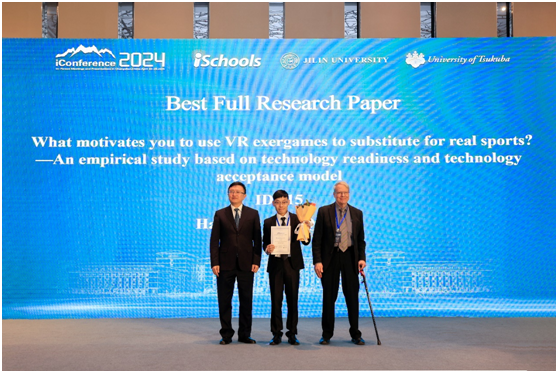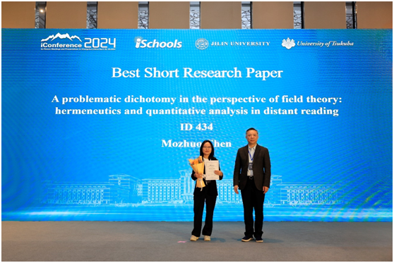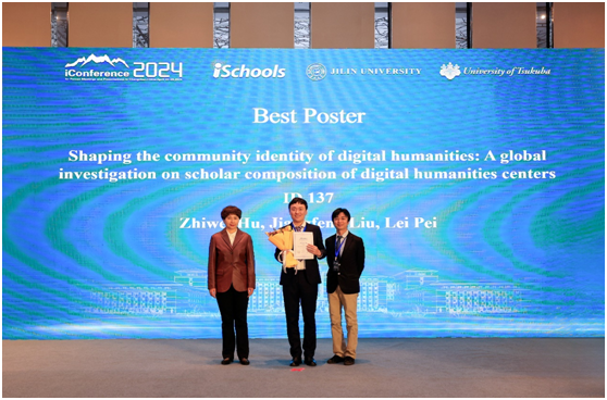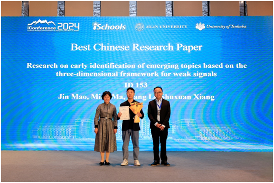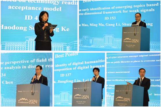致辞结束后,进入最佳论文颁奖环节。会议评选出最佳长论文一等奖1项,最佳长论文二等奖1项,最佳长论文入围奖3项,最佳短论文一等奖1项,最佳短论文二等奖1项,最佳短论文入围奖3项,最佳中文论文奖1项,最佳中文论文入围奖4项,最佳海报一等奖1项,最佳海报二等奖1项,最佳海报入围奖3项。iConference 2024长论文主席马捷、iConference 2024中文论文主席张洋、iConference 2024短论文主席Masanori Koizumi、iConference 2024大会主席Atsuyuki Morishima与郭英彤分别宣读了获奖名单。