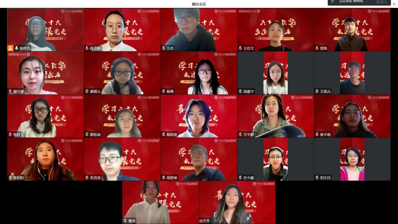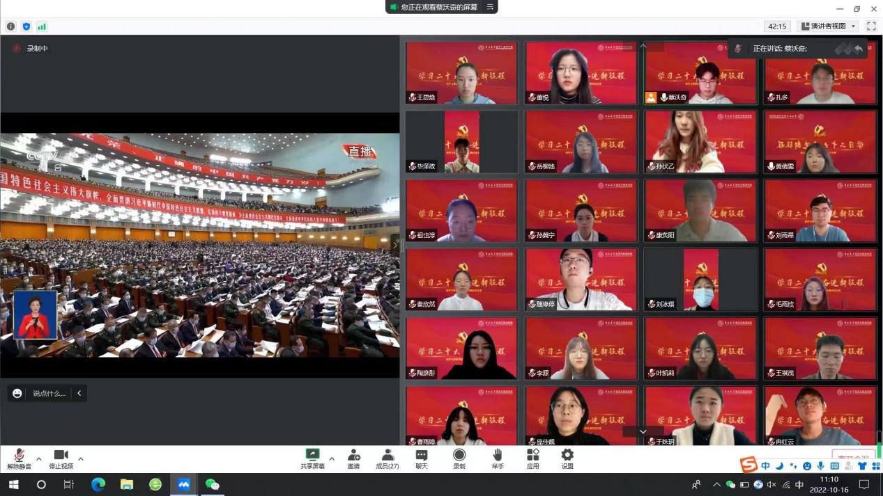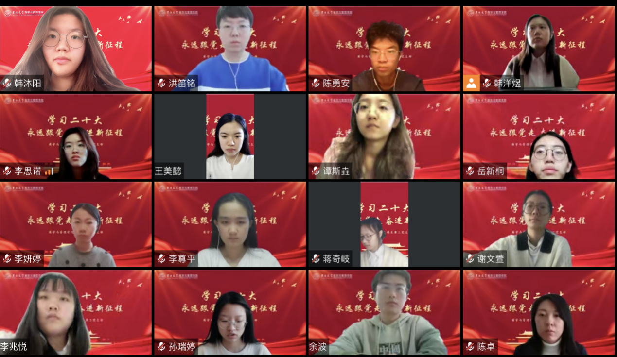 报告的内容,让在座党支部每个人心融神会,从经济到国防,从脱贫攻坚到科教兴国,再到新时代“实现中华民族伟大复兴”的宏图壮志……青春之梦生生不息,助推中华民族实现从站起来、富起来到强起来的伟大飞跃。在新的历史方位,在第二个百年英勇前进的氛围中,作为基层党支部应学习党的新思想新方略,要珍惜党开创的美好时代,紧跟党和时代的步伐,扛起肩上的重担,深入基层服务学生,为实现中华民族的伟大复兴贡献力量。商管党员在收听报告后感到了深深的共鸣,将以更加饱满的热情,昂扬的斗志,同心同德,继往开来,不辱使命。在习近平新时代中国特色社会主义思想伟大旗帜的引领下,我辈青年必将高举时代旗帜,踔厉奋发前进,用更加优异的学业科研成果向党的二十大献礼。我们将永远追随党的脚步,自觉听从时代召唤,以青春之韶华,奉献党的千秋伟业!