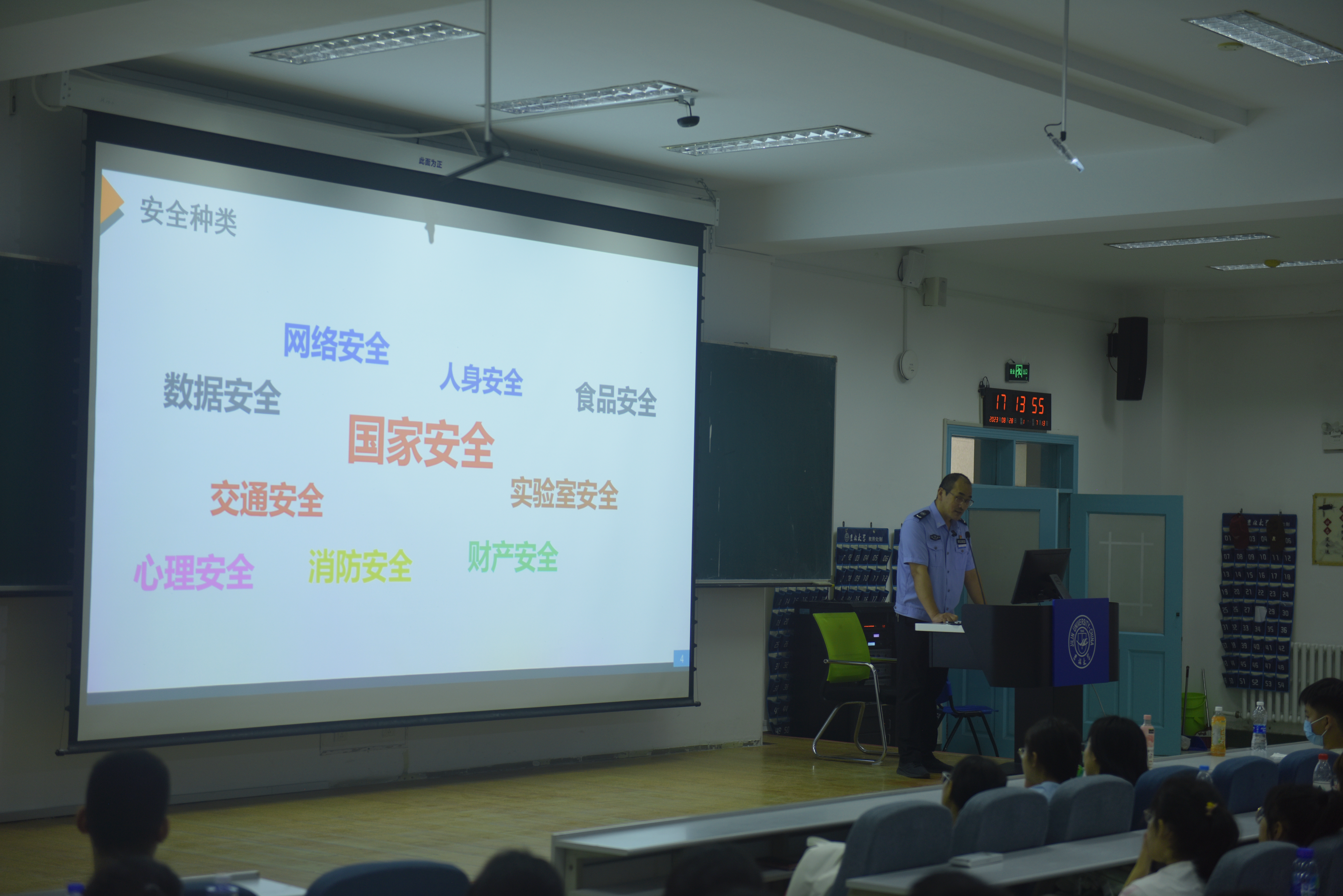 讲座之初,保卫处老师先向大家介绍了财产安全、网络安全、人身安全、食品安全、数据安全、国家安全、实验室安全、交通安全、心理安全以及消防安全,并依次详细展开阐述,意在提高同学们的安全意识。