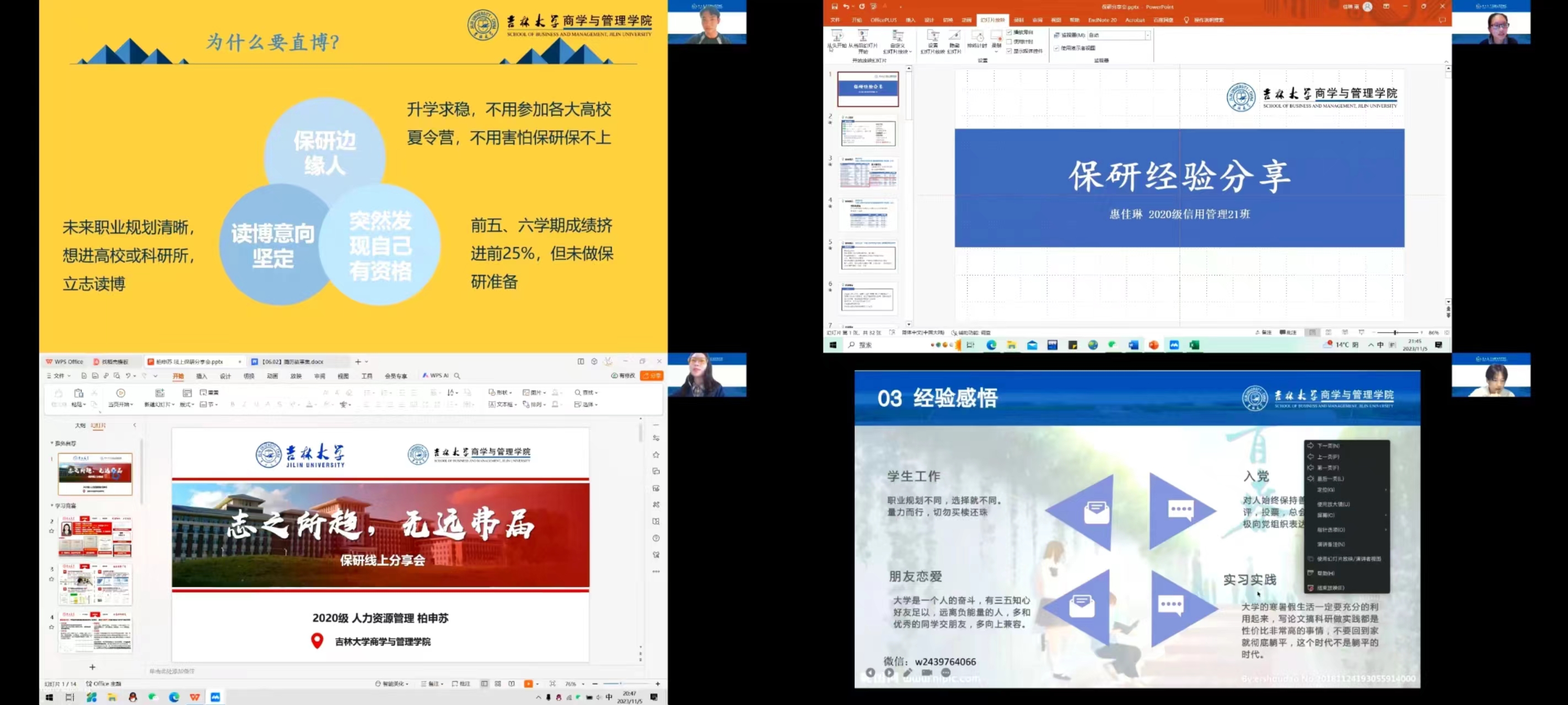 开展了第二期的经验分享会。本次分享会邀请了2020级优秀学生陈功坤、柏申苏、王宏鑫以及惠佳琳,四位同学结合自身保研、直博经历,从不同角度向参会同学们介绍如何能够在激烈的竞争中获得宝贵的录取名额,同时回答同学们疑问。