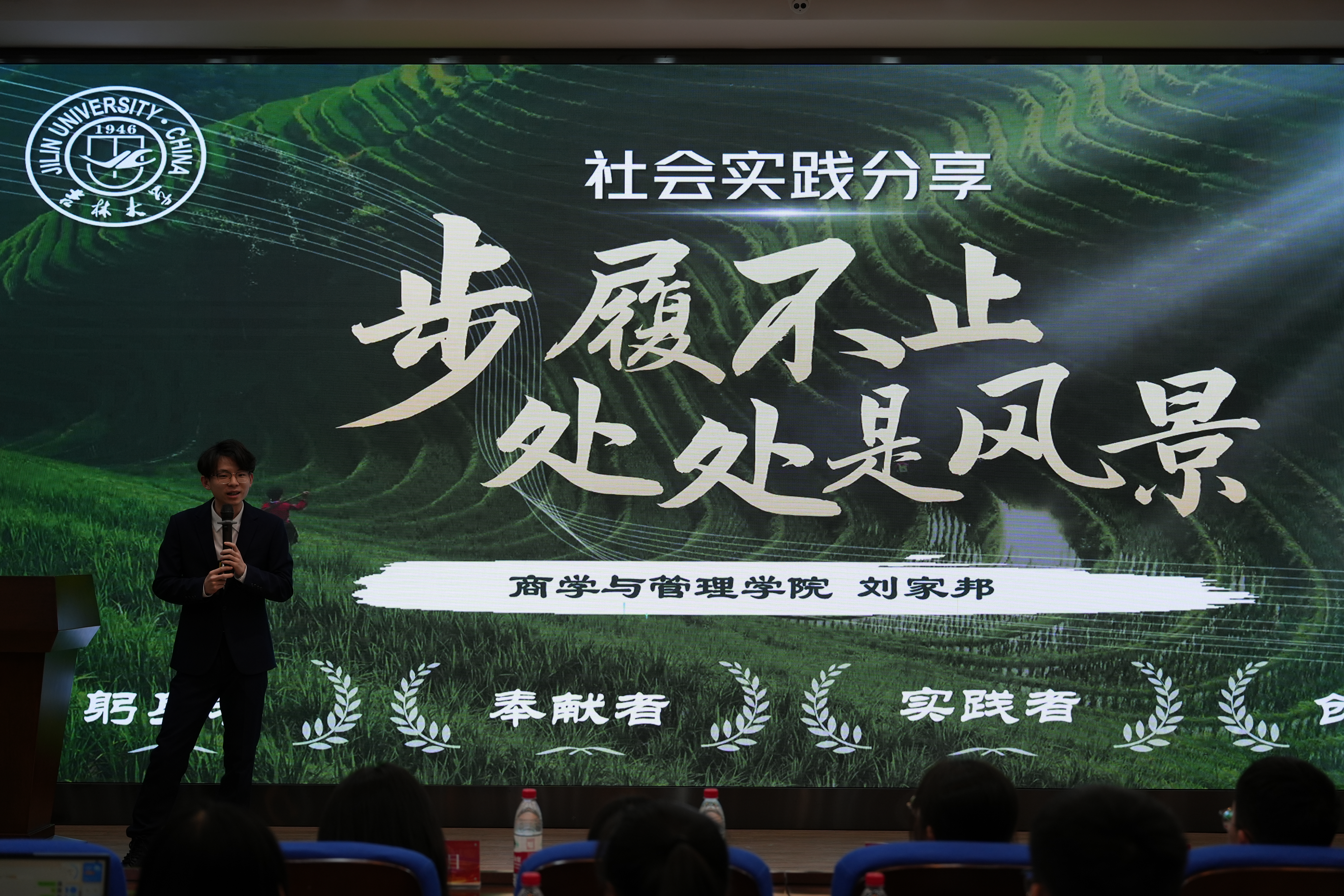 大会第三项,获奖队伍代表刘家邦、梁楷悦、邵桂含、万锐捷依次上台,分享了他们在社会实践活动中的经验和感悟。他们分别从不同的角度讲述了自己在实践中的所见所闻、所思所感,以及如何将理论知识与实践相结合,解决实际问题。他们的分享不仅让在场的同学们深受启发,也为今后开展社会实践活动提供了宝贵的经验。
