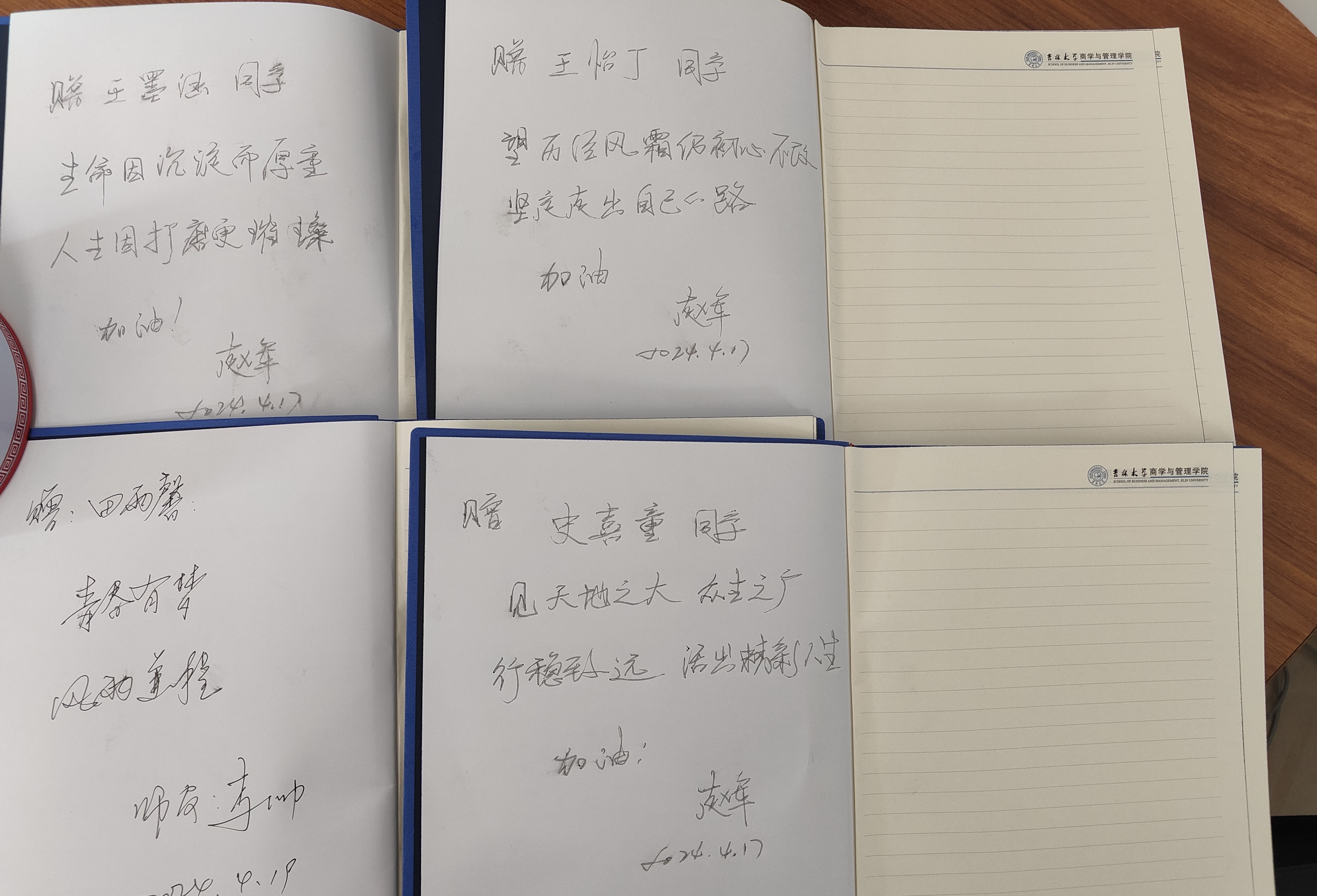 党委书记赵军老师、李帅老师、陈卓老师和罗小杰老师写下的对转出同学的殷切希望和衷心祝福。